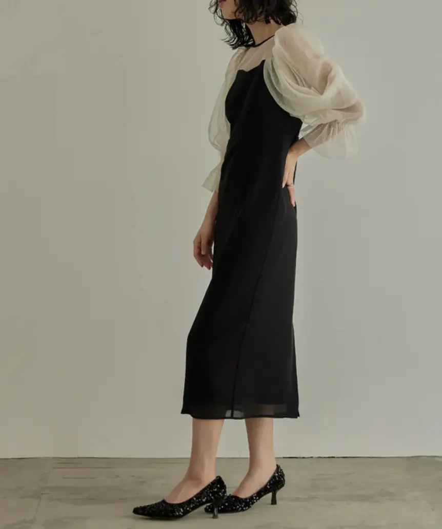 透け感のあるキャンディスリーブがフェミニンな雰囲気を加え、タイトシルエットのスカートが全体を引き締めます。