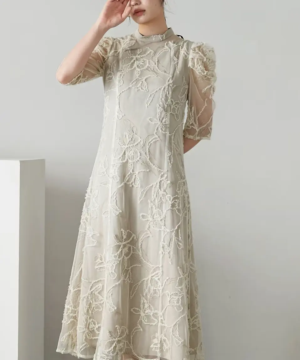 フリンジアクセントとラメ入り刺繍が華やかな印象を与えるチュール刺繍レース生地のワンピースドレス。