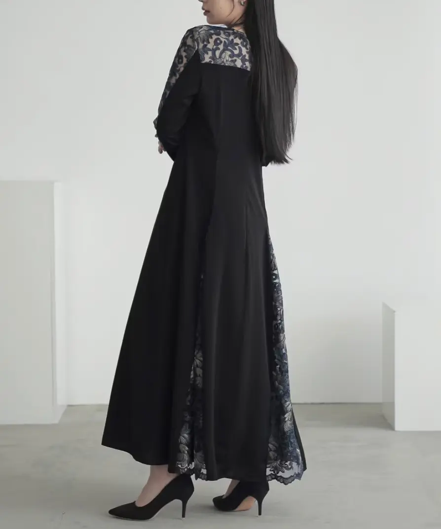 繊細なチュール刺繍が上品な印象を与えるワンピースドレス。