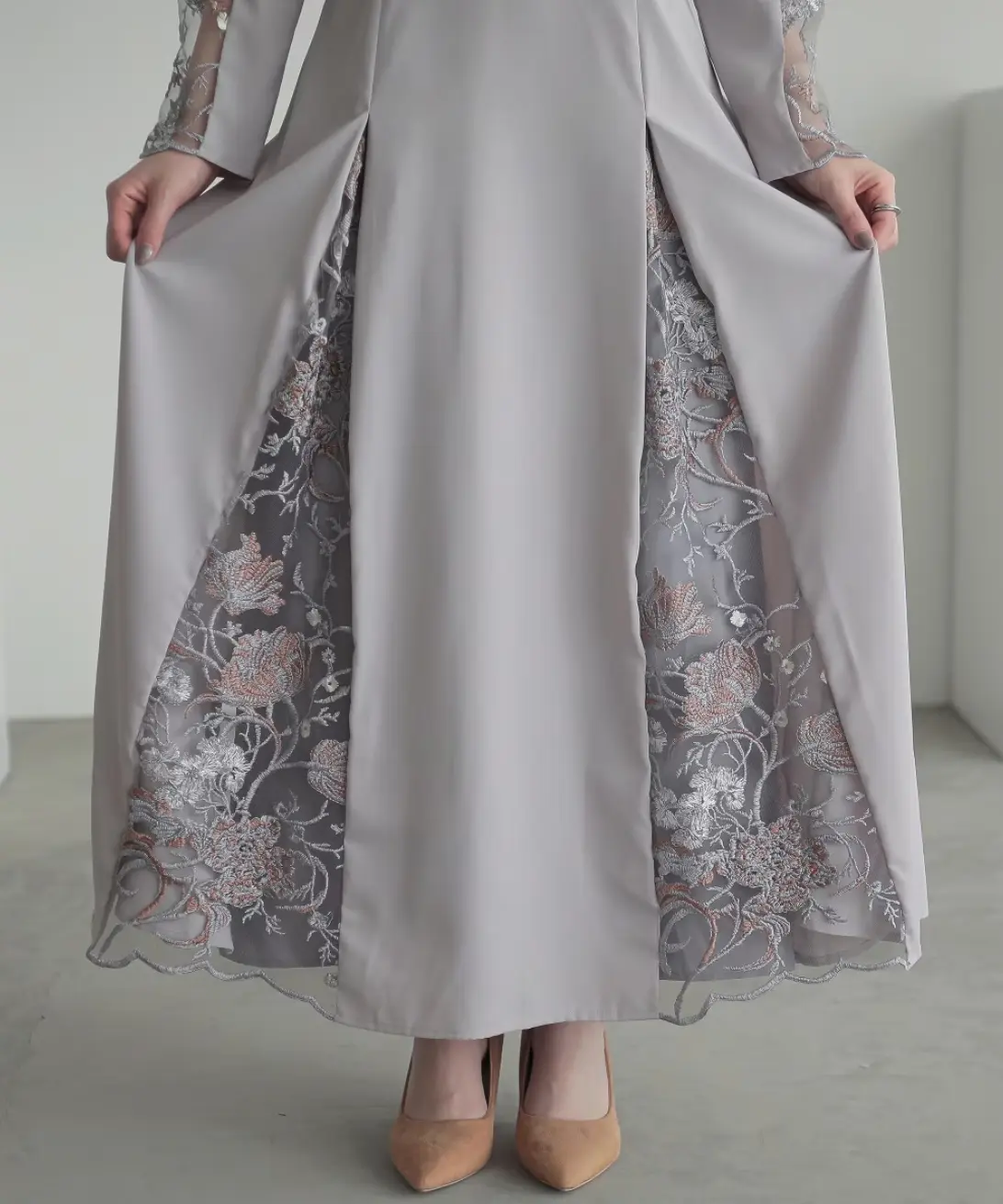 繊細なチュール刺繍が上品な印象を与えるワンピースドレス。