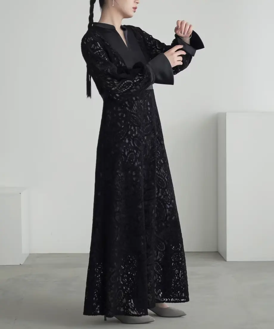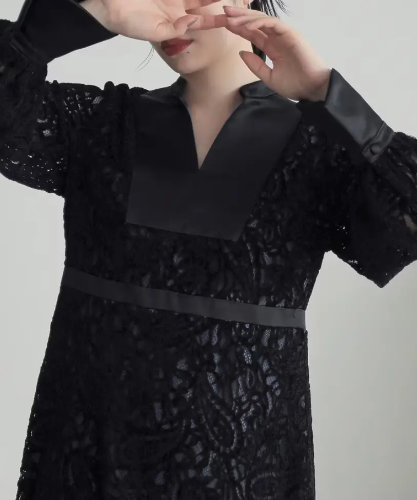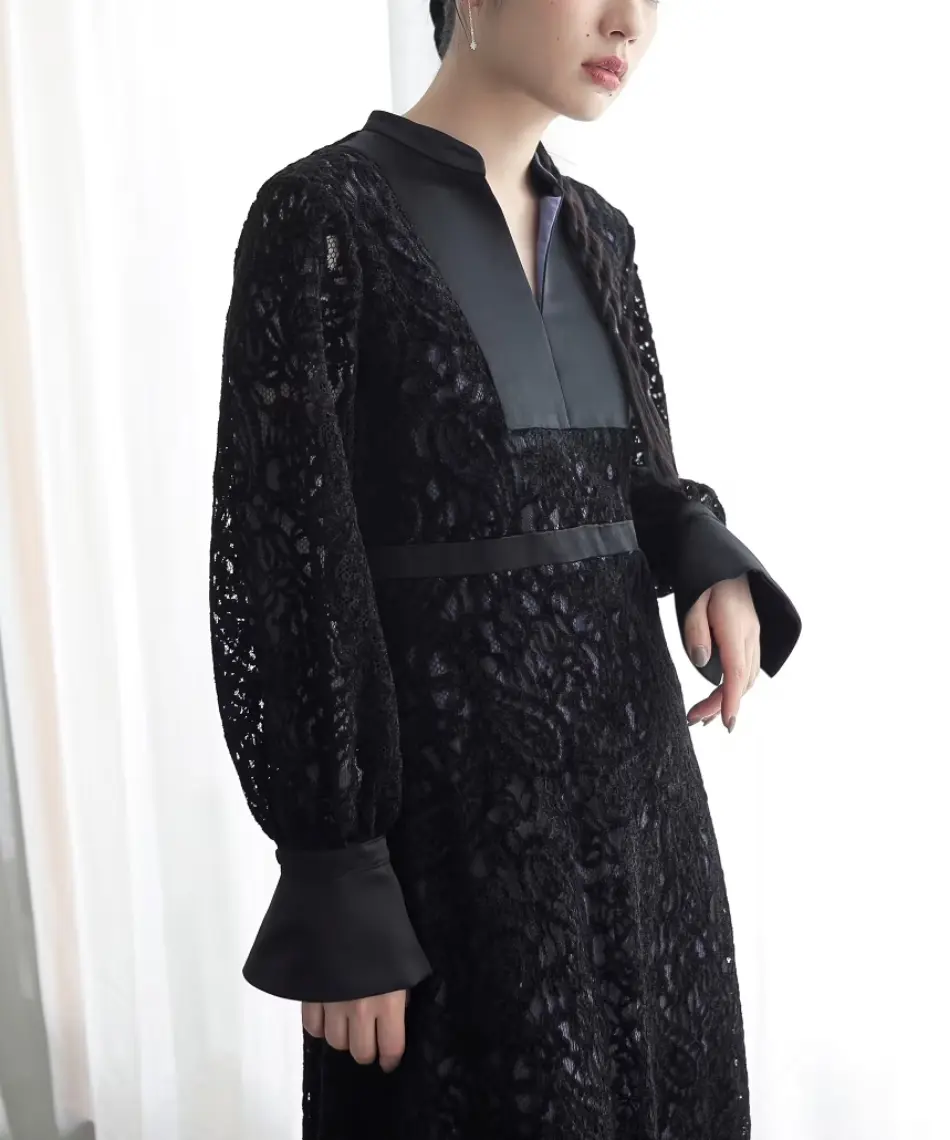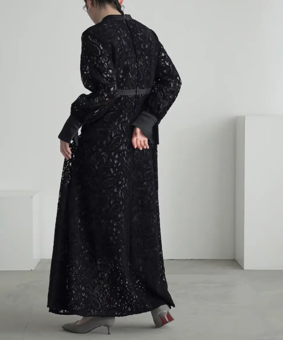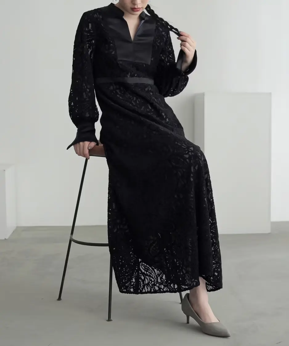 表面感のある起毛レースを使用した、高級感が漂うワンピースドレス。