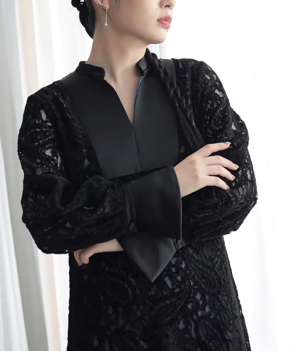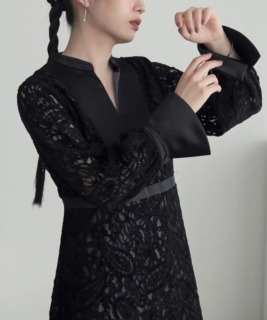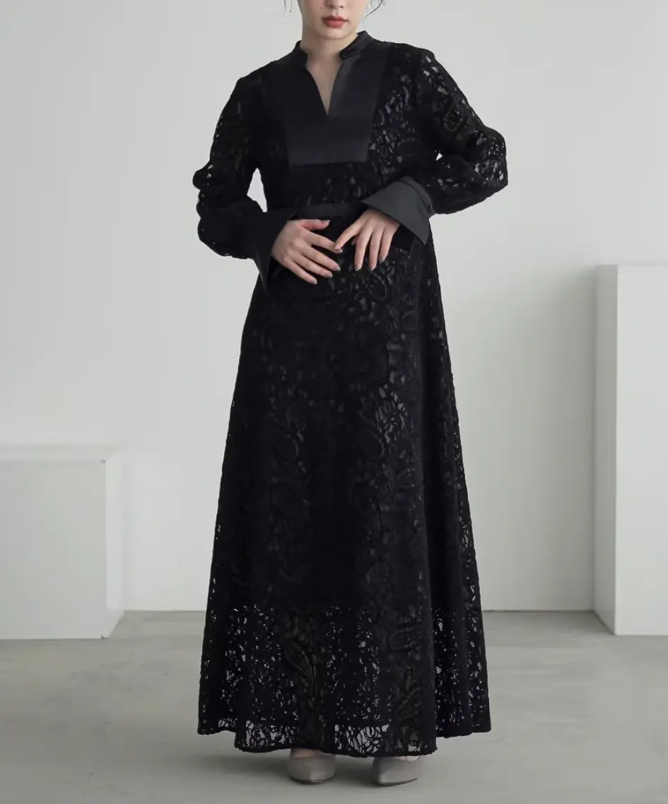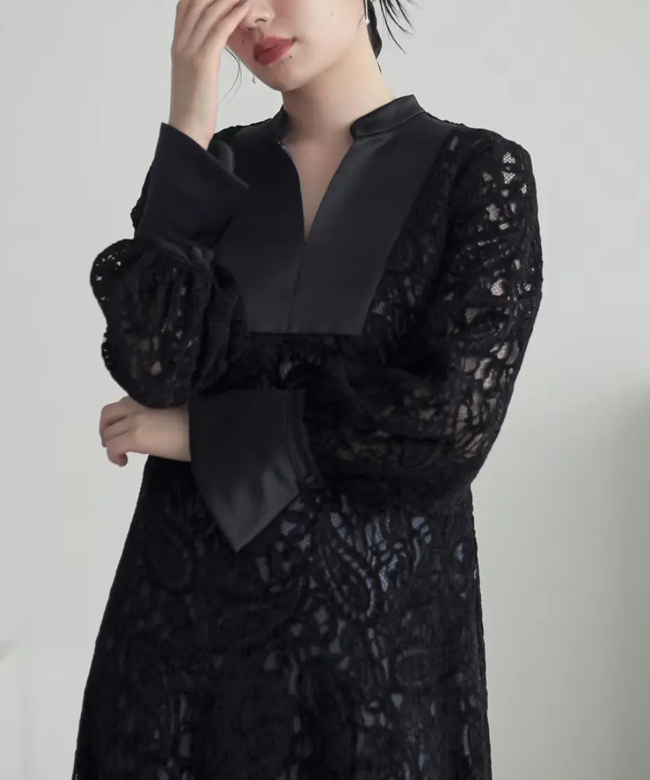 表面感のある起毛レースを使用した、高級感が漂うワンピースドレス。