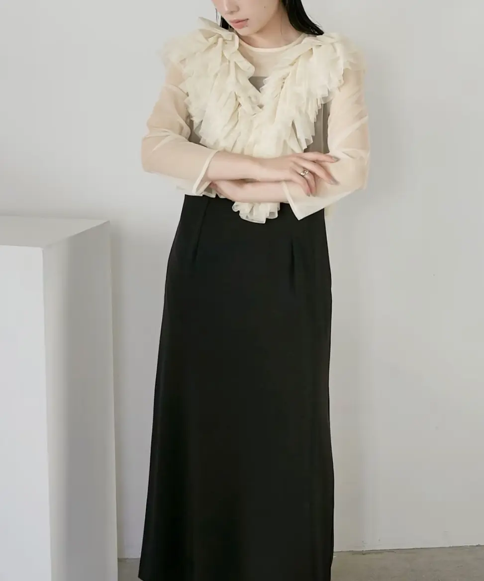 肌触りのいいチュールフリルデザインの、エレガントさを際立たせるワンピースドレス。