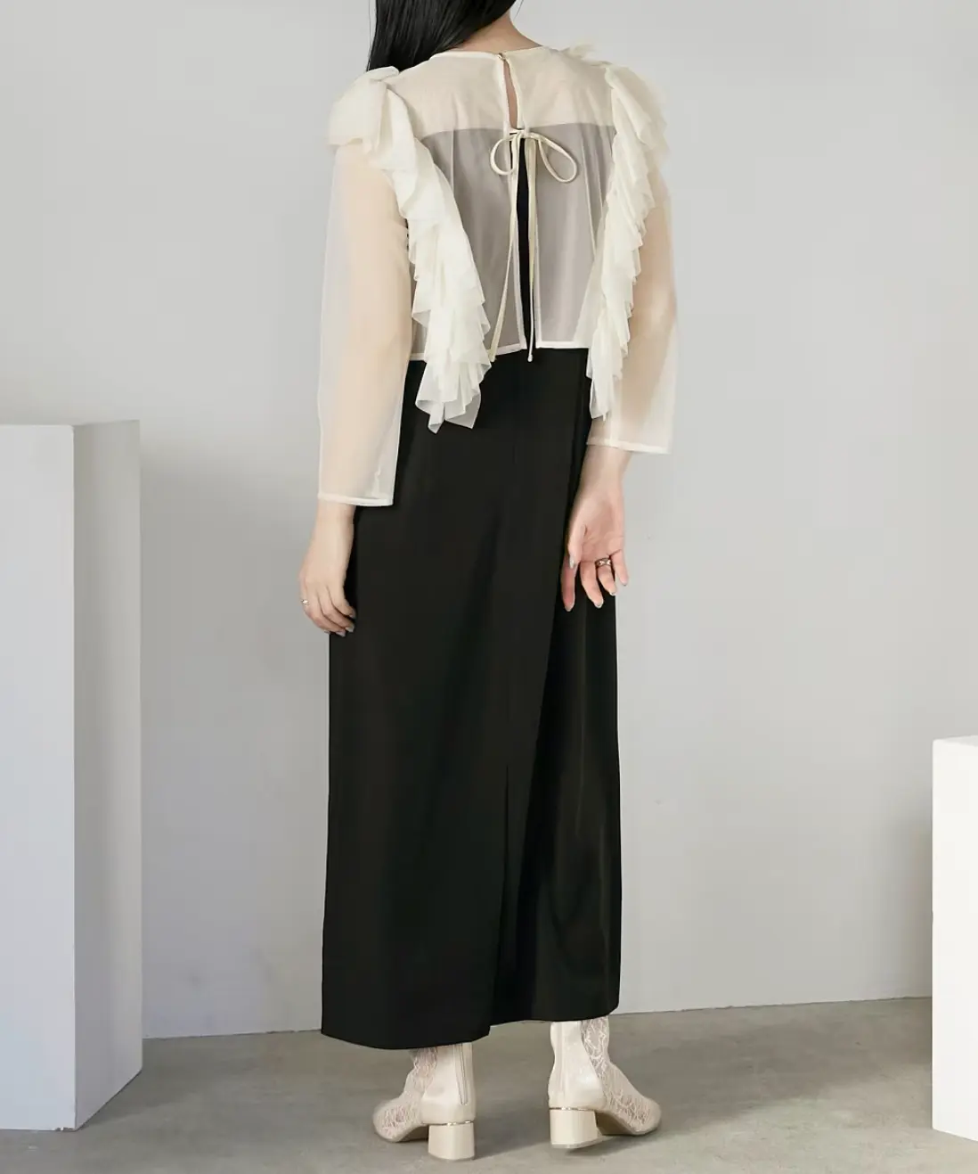 気になる二の腕をおしゃれにカバーし、ロング丈でスタイリッシュなシルエットに。