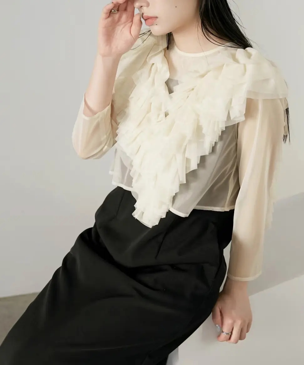 肌触りのいいチュールフリルデザインの、エレガントさを際立たせるワンピースドレス。