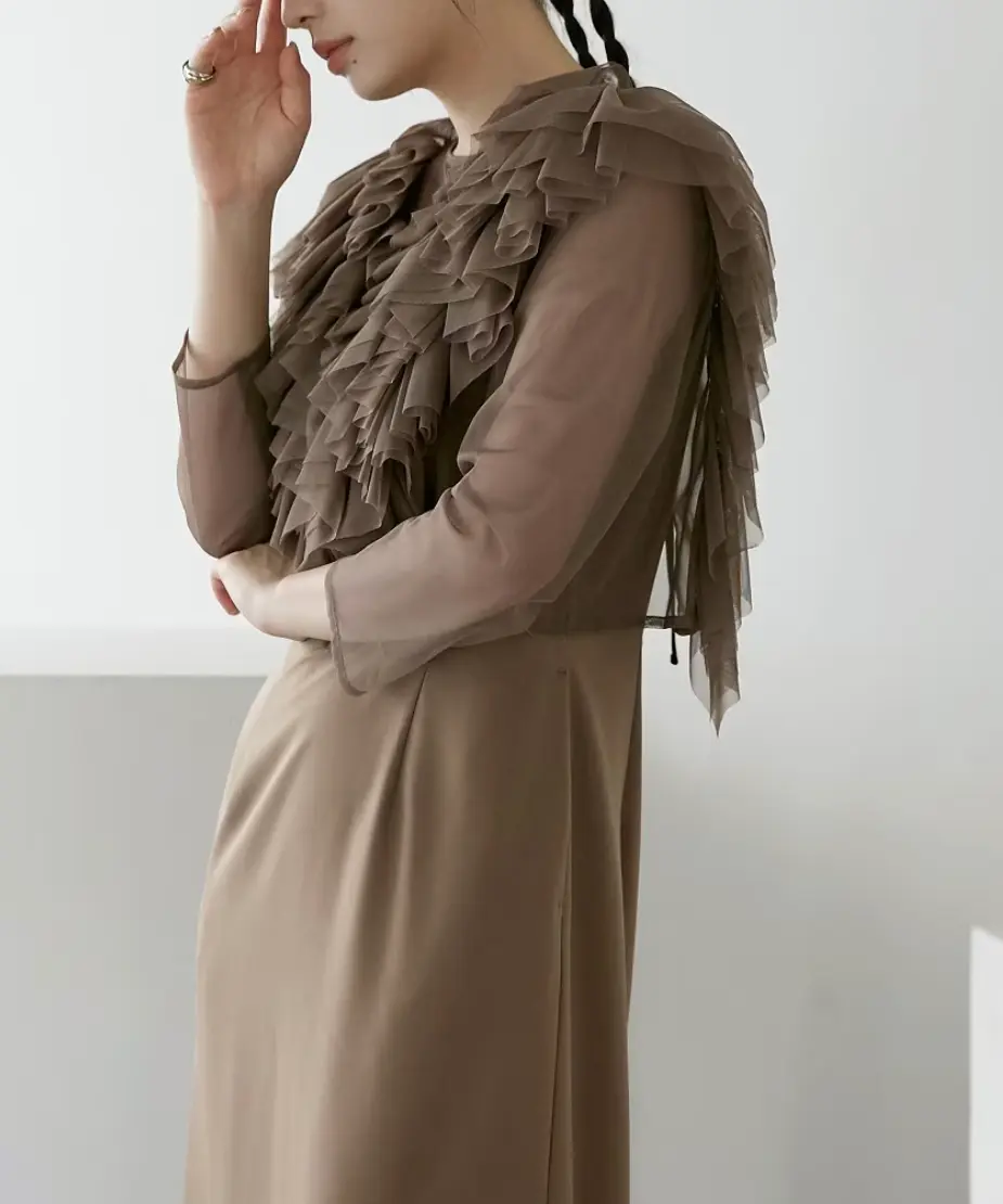 肌触りのいいチュールフリルデザインの、エレガントさを際立たせるワンピースドレス。