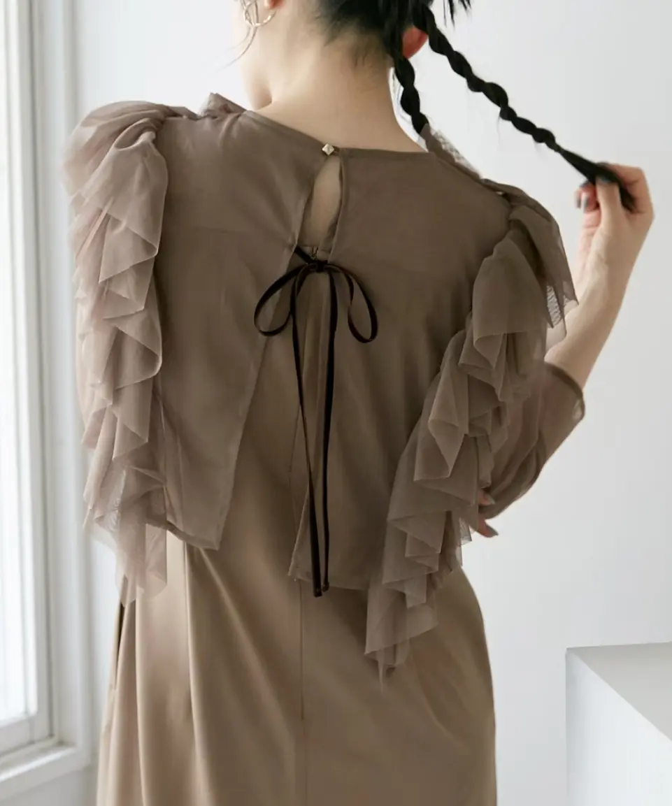 肌触りのいいチュールフリルデザインの、エレガントさを際立たせるワンピースドレス。