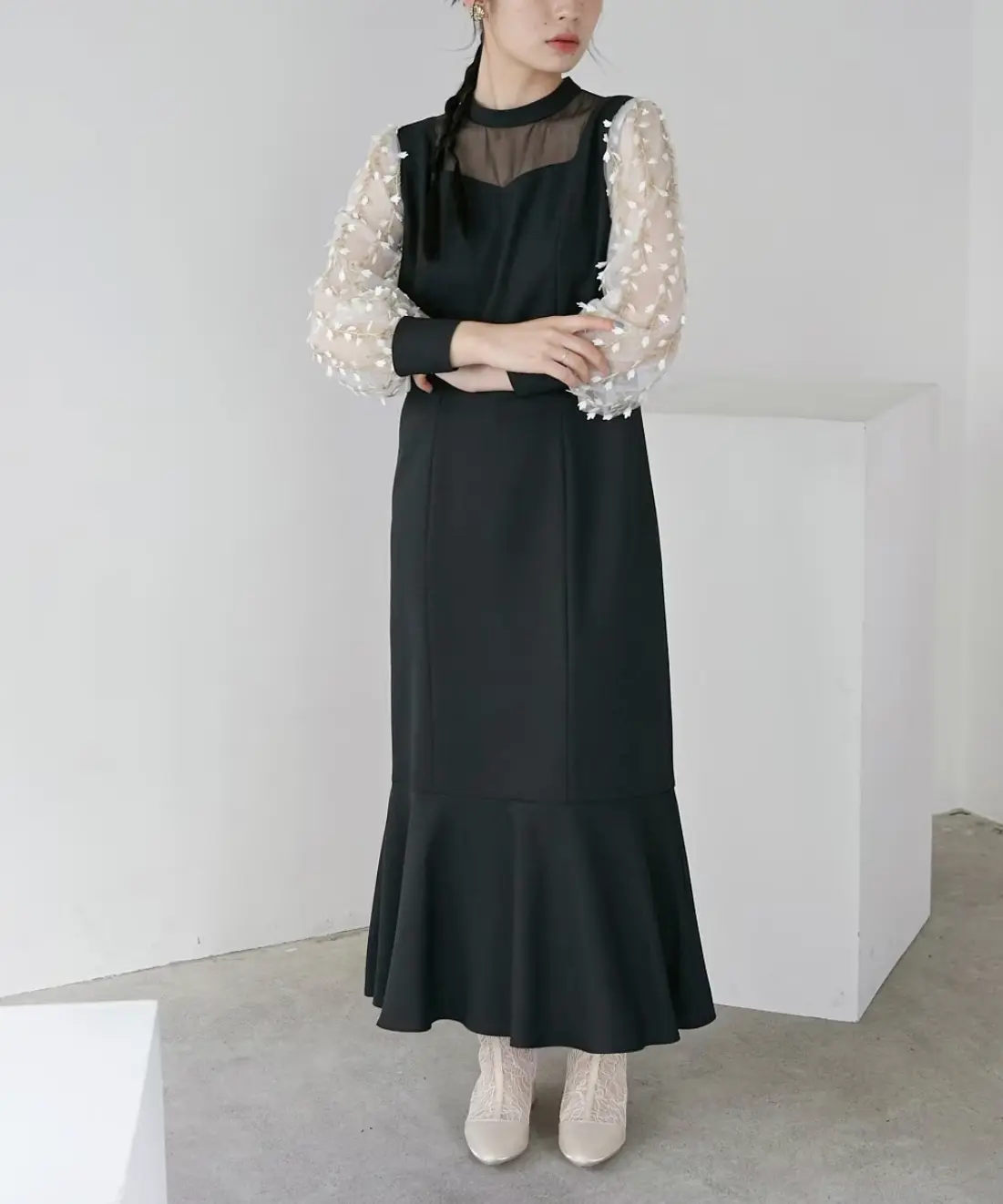 繊細で立体的な花柄チュール刺繍素材が華やかさを表現してくれるワンピースドレス。