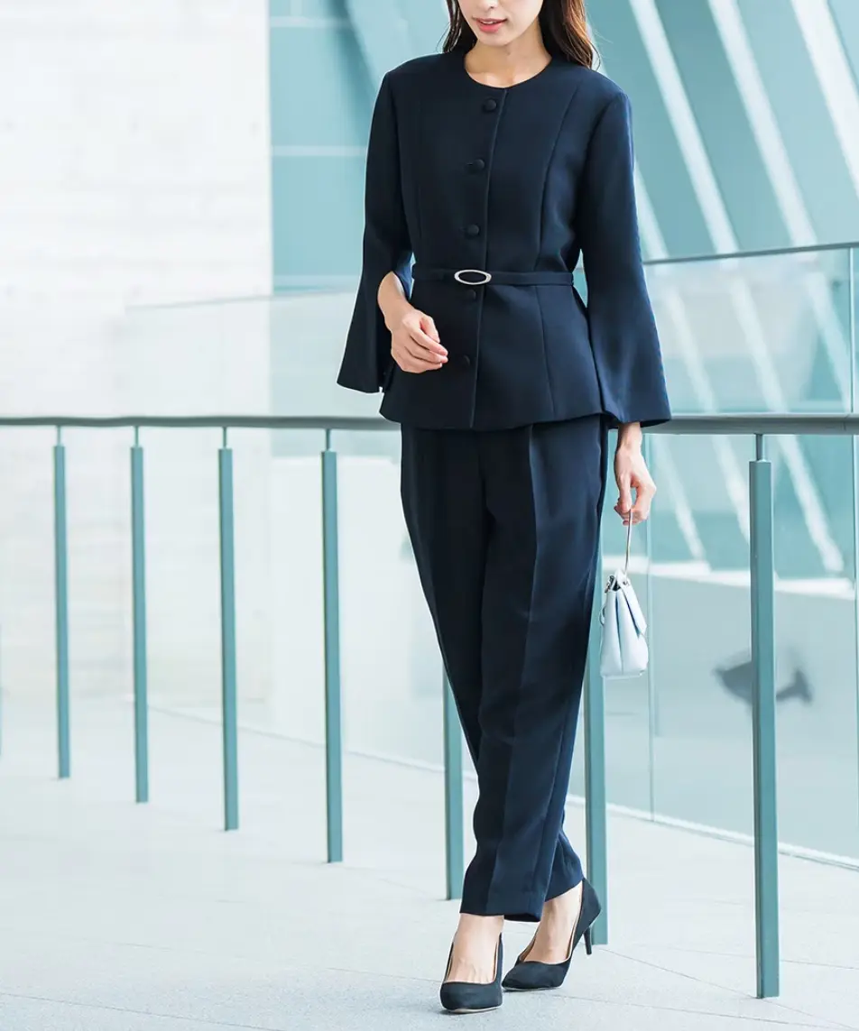 袖スリットデザインでスタイリッシュなノーカラージャケットの、スタイリッシュなパンツスーツ。