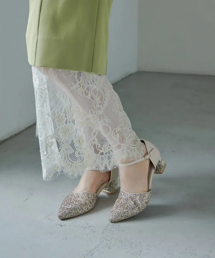 グリッターとエナメルを組み合わせ、足元を華やかに演出してくれるチャンキーヒールパンプス。