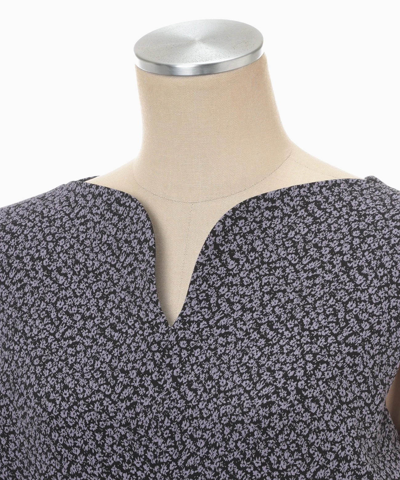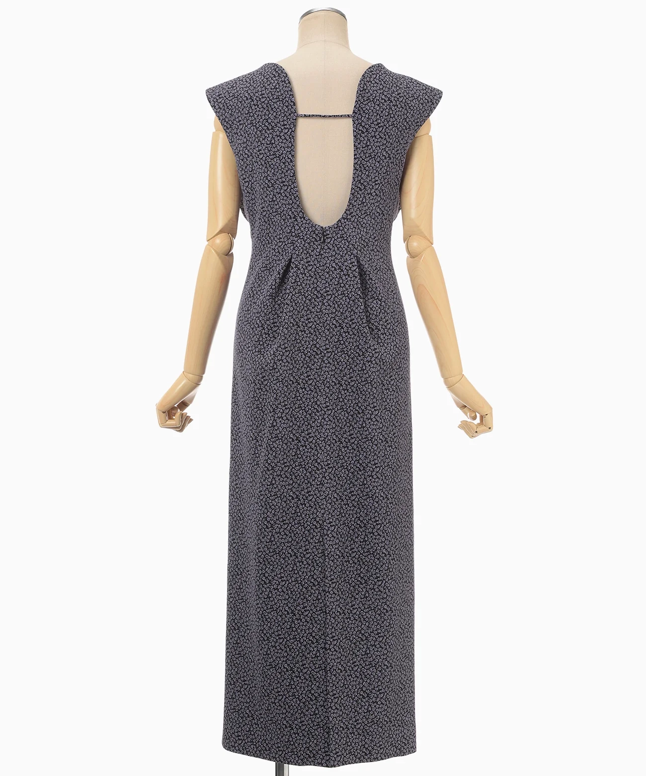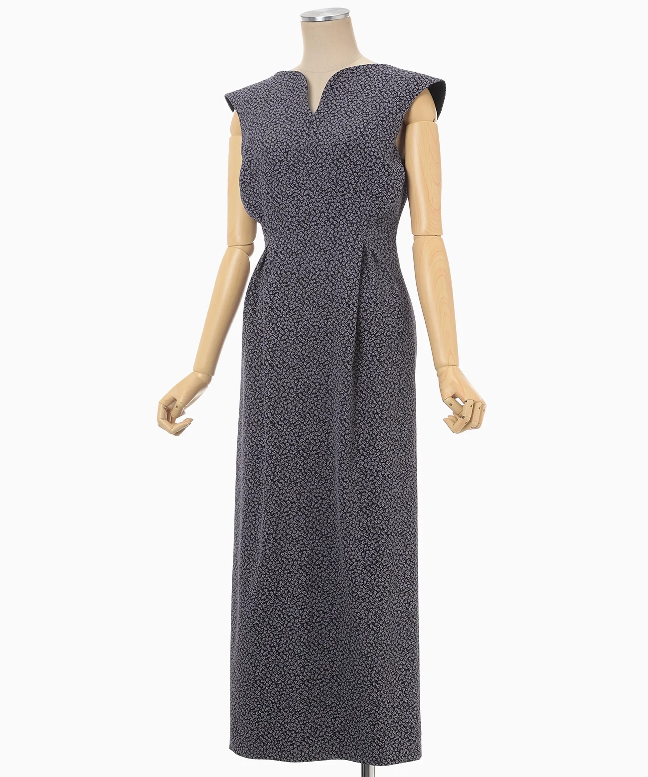 小花柄が魅力的なアセテートレーヨン通風ジャカード生地を使用。ポリエステルのソロテックス糸を緯糸に採用し、ポコポコとした凹凸感ある表情を実現。ウエストのタックがコンパクトな身頃から広がる洗練されたシルエットを生み出し、印象的なデザインに。