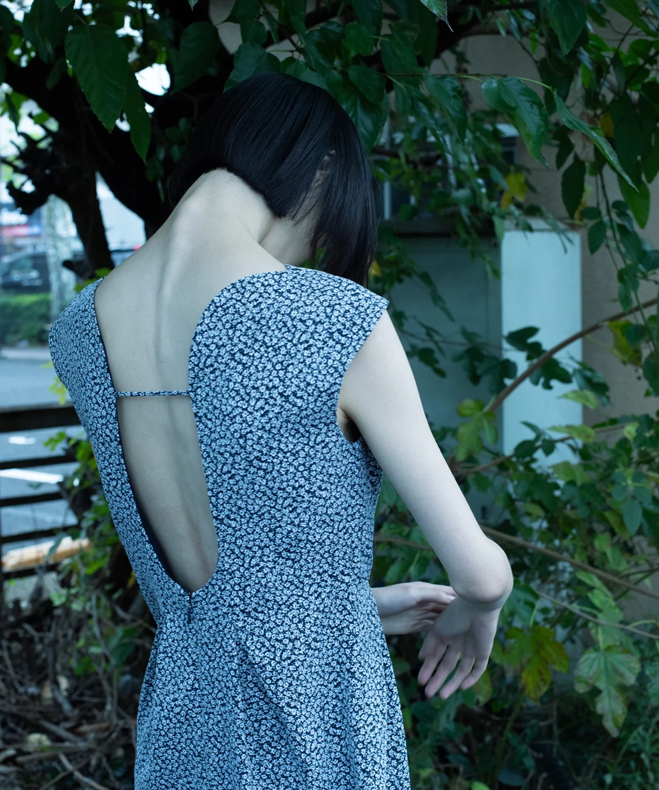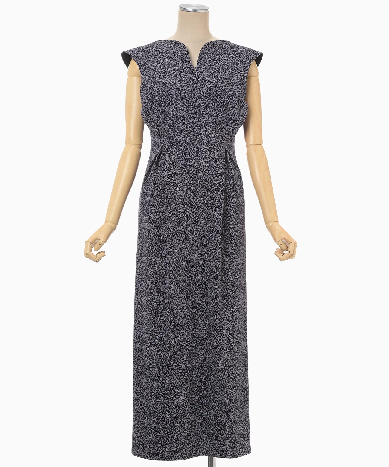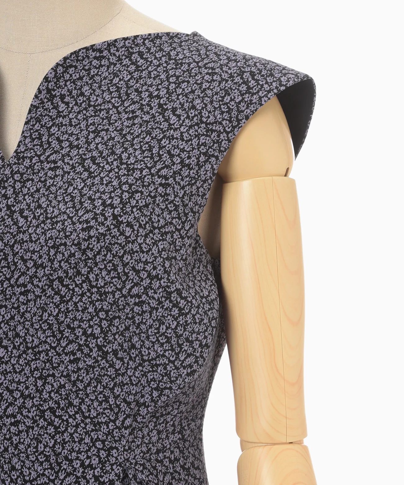小花柄が魅力的なアセテートレーヨン通風ジャカード生地を使用。ポリエステルのソロテックス糸を緯糸に採用し、ポコポコとした凹凸感ある表情を実現。ウエストのタックがコンパクトな身頃から広がる洗練されたシルエットを生み出し、印象的なデザインに。