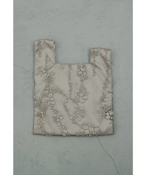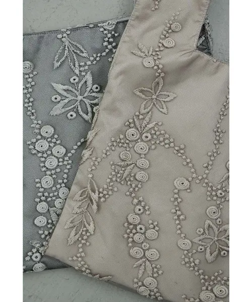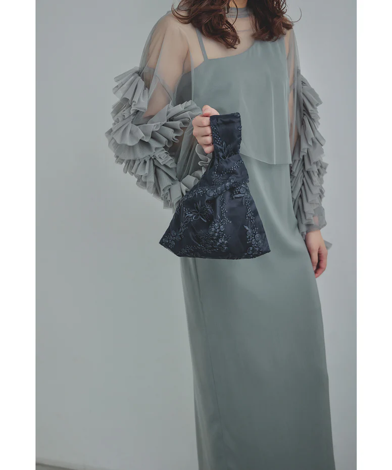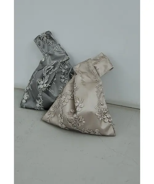 艶のあるサテン生地に繊細な刺繍レースを重ねた、上品なワンハンドルバッグ。