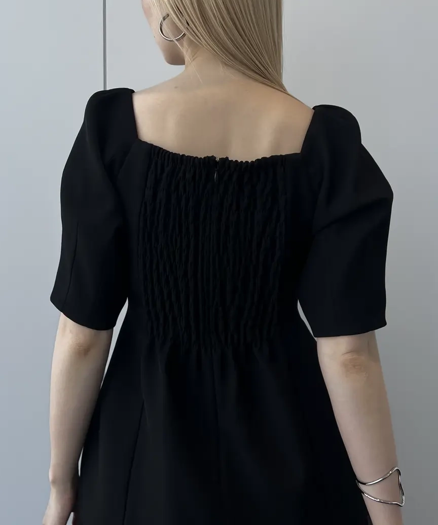 バスト下はシャーリング仕様、スカートのウエストも後ろゴムで、見た目だけでなく着心地も快適。