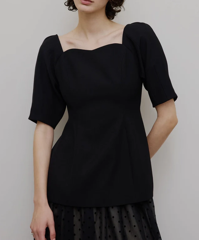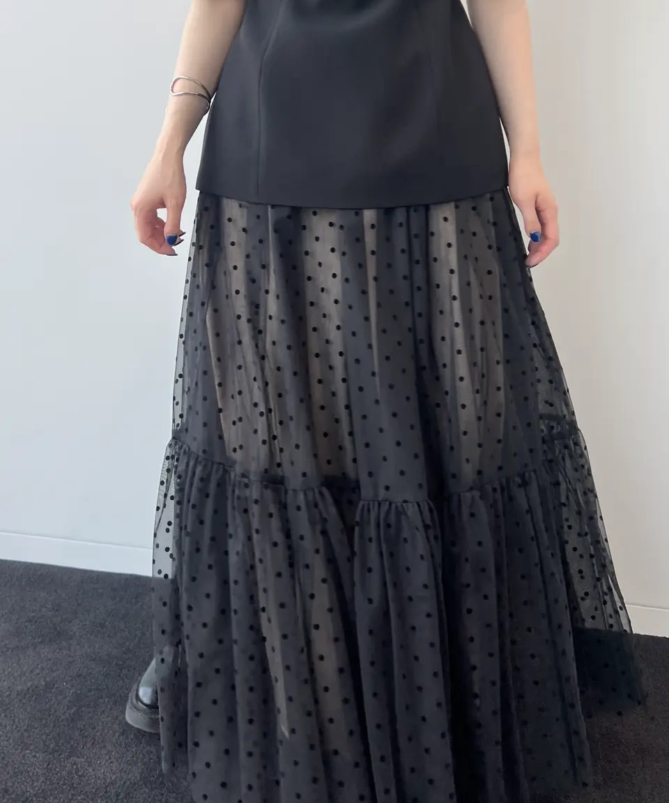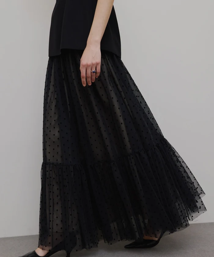 スカートの裏地にはあえてベージュを使用し、ブラックチュールとのレイヤードで新鮮な印象に。
