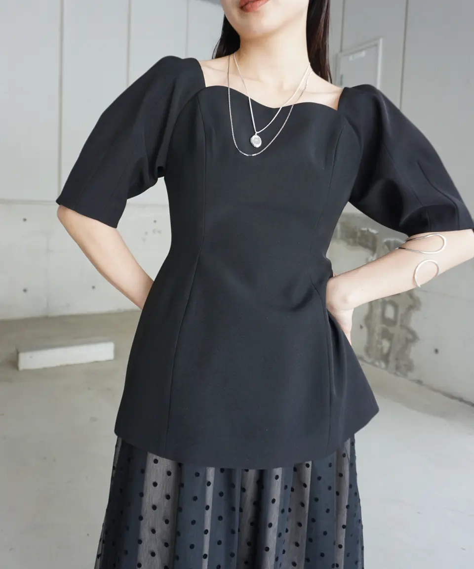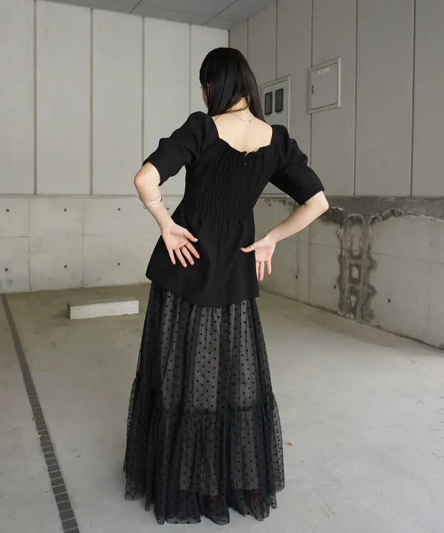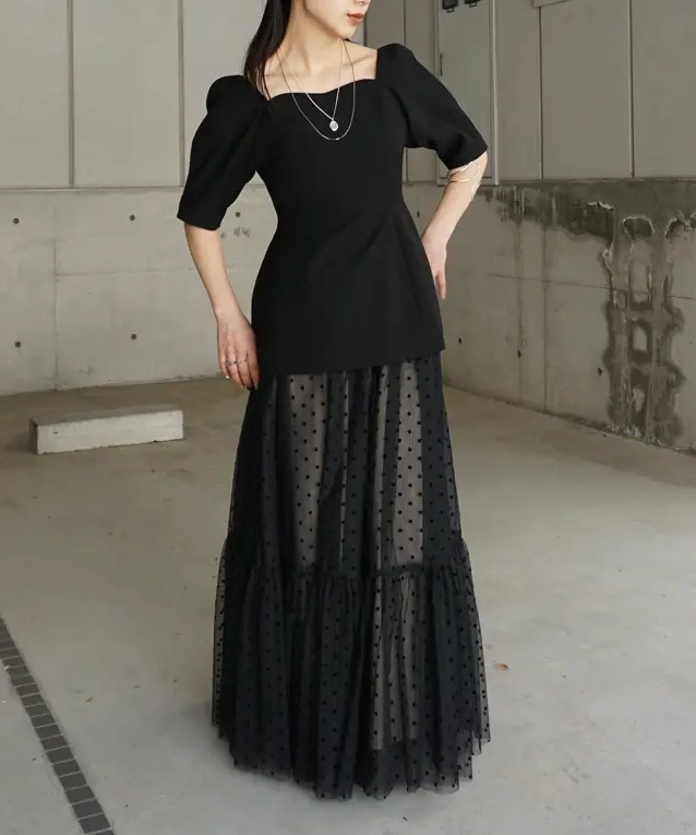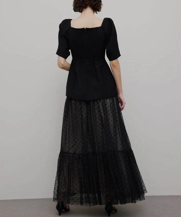 ウエストラインを美しく見せるトップスと、ドットチュールが目を引くスカートのセットドレス。
