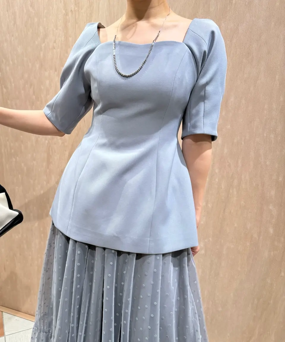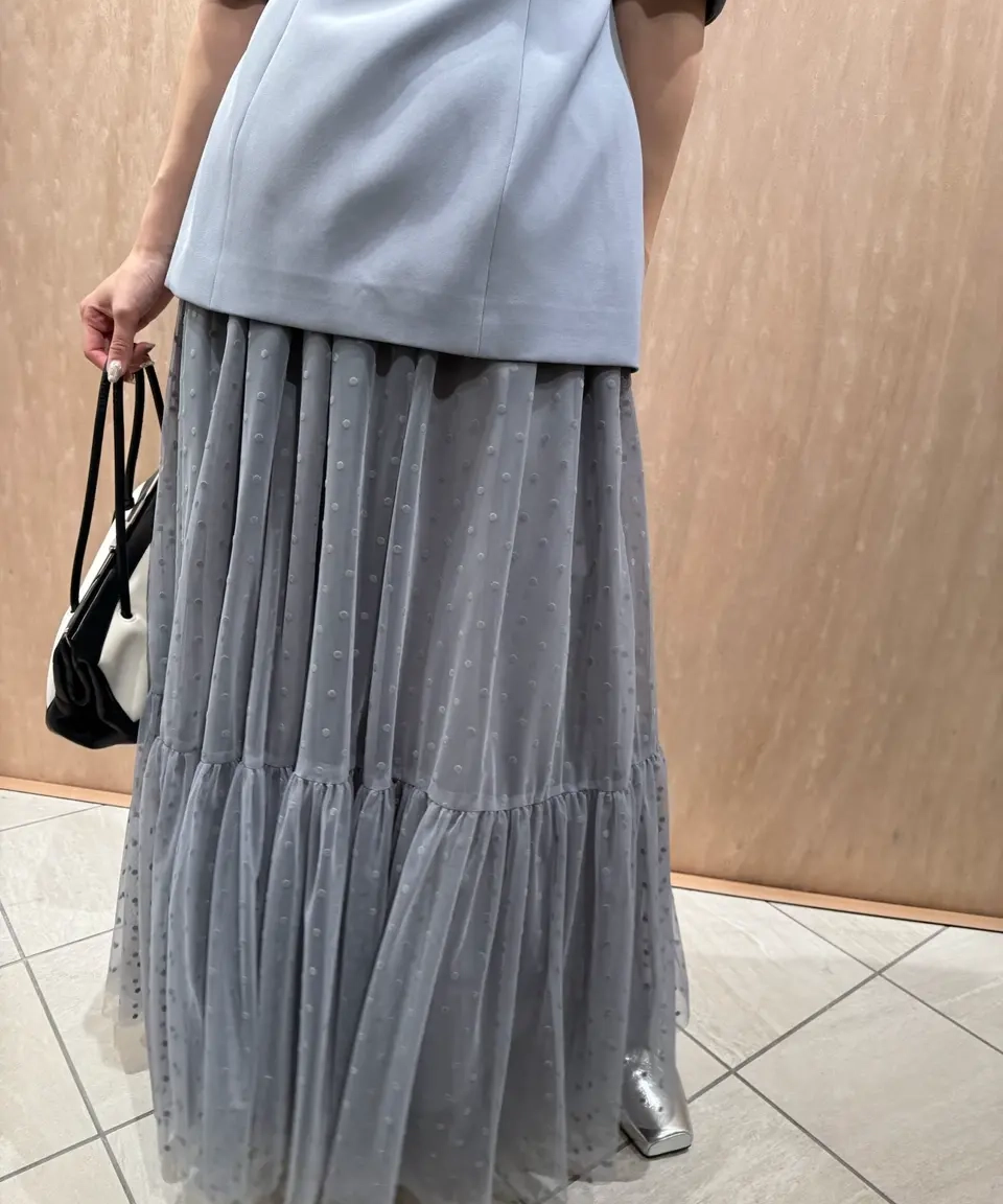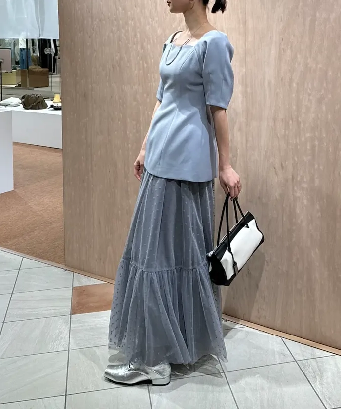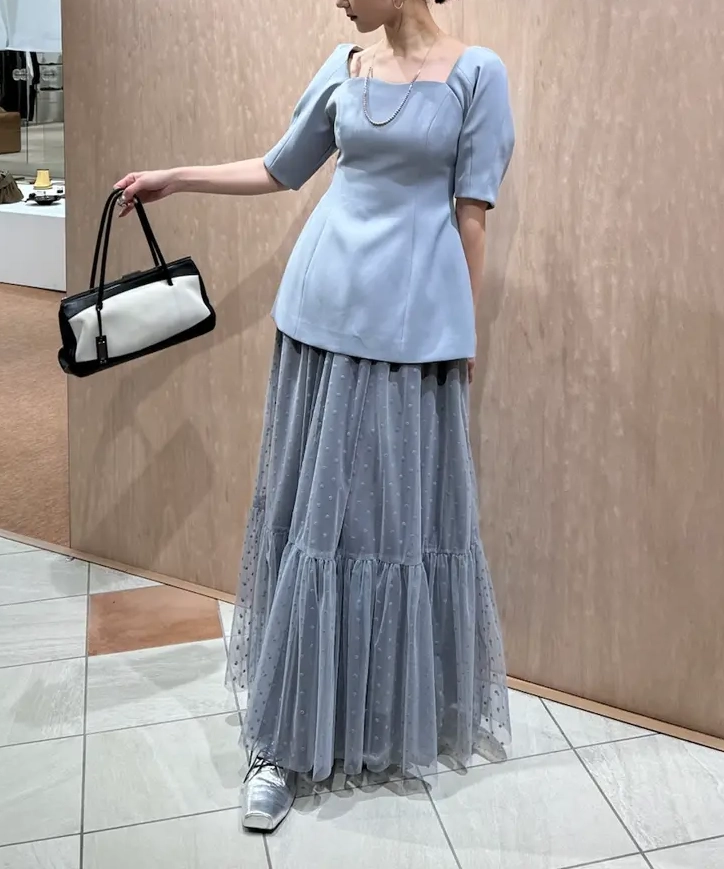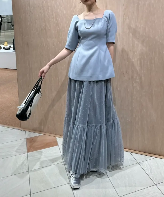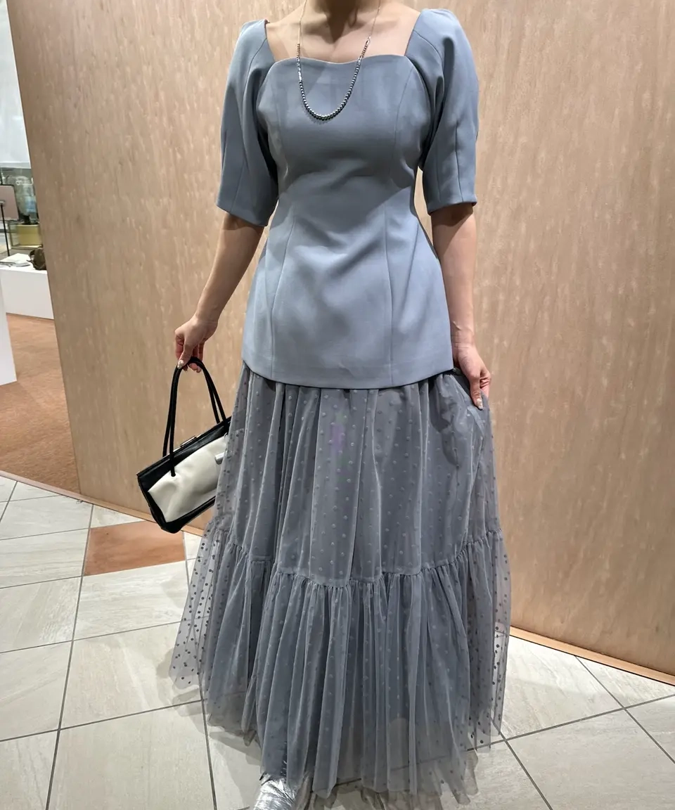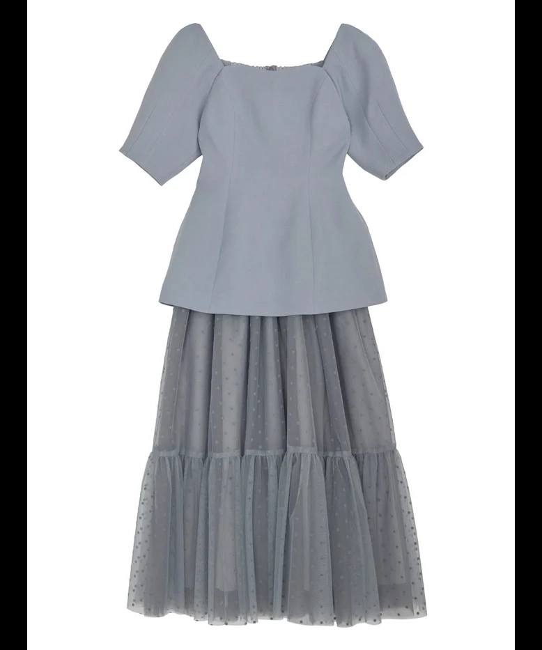 ウエストを美しく見せるトップスと、ドットチュールが華やかなスカートのセットドレス。淡いブルーグレーとベージュの配色が洗練された印象に。上下別でも使える着回し力が魅力です。オケージョンや特別なお出かけにおすすめ!