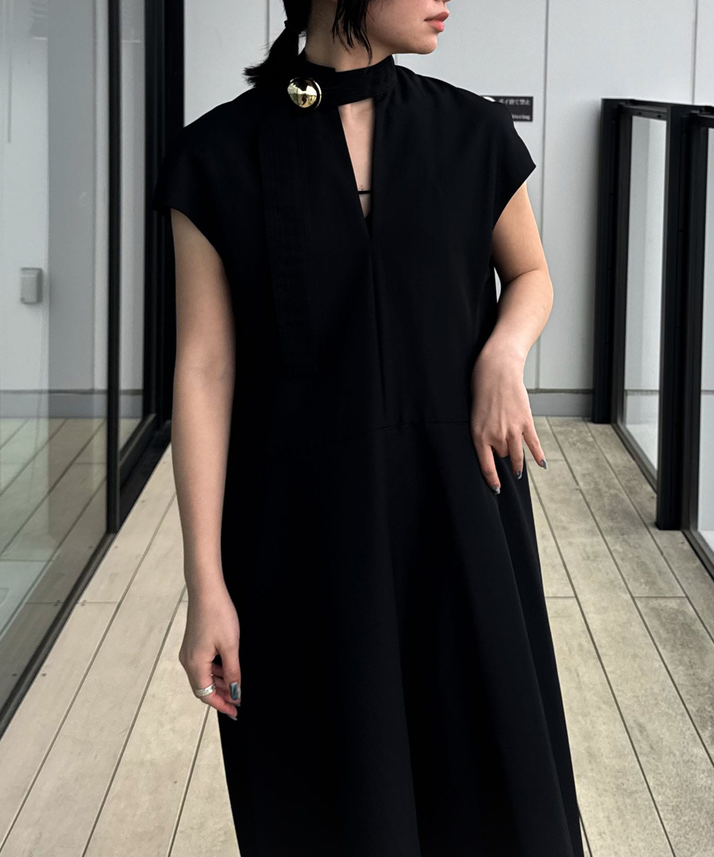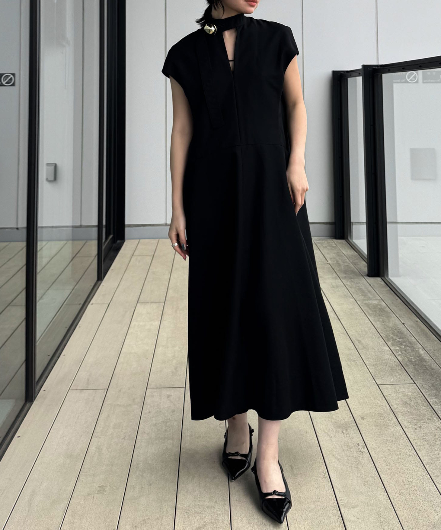 デコルテを美しく見せるV開きに、上品なボウタイ風ディテールが印象的です。