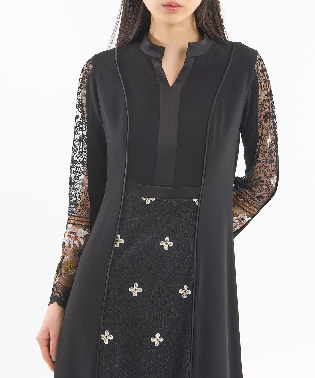 発色の良い土台生地のおかげで、レースの柄がくっきり浮かび上がり、立体感と高級感を同時に楽しめます。結婚式やアートギャラリーのレセプションなど、特別な日にぜひ着てほしい名品ドレスです!