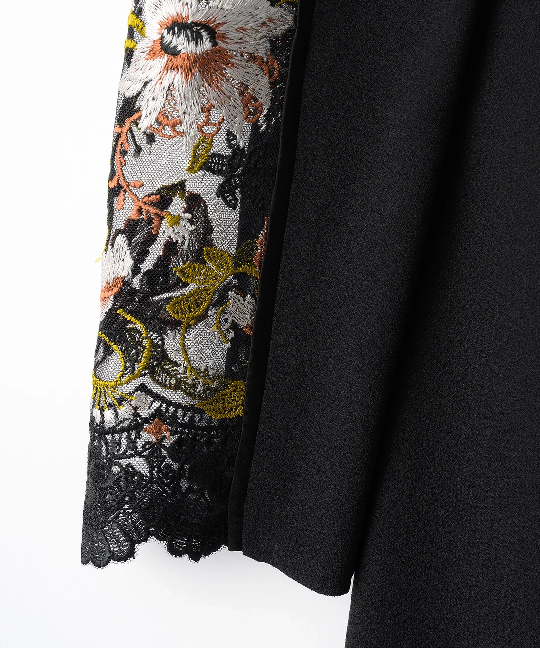 採用したのは、2019年春夏コレクションで誕生したオリジナル柄のエンブロイダリーレース。絵画をモチーフに、美しくもどこか危うさを秘めた花を描き出しています。