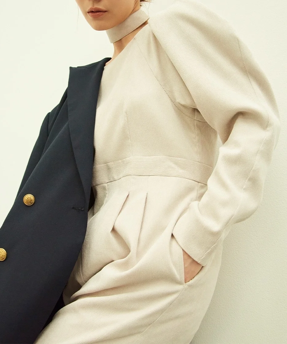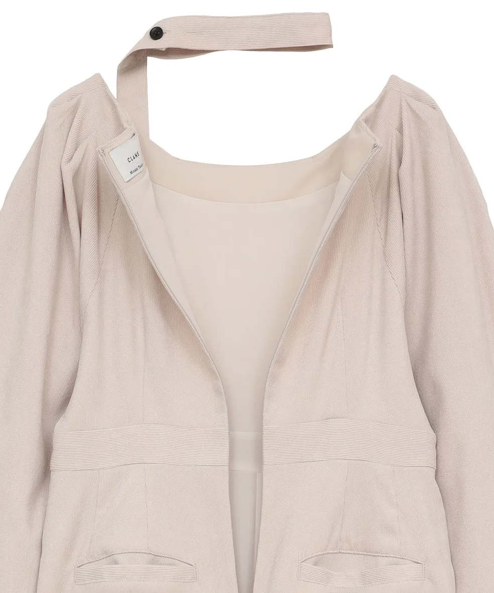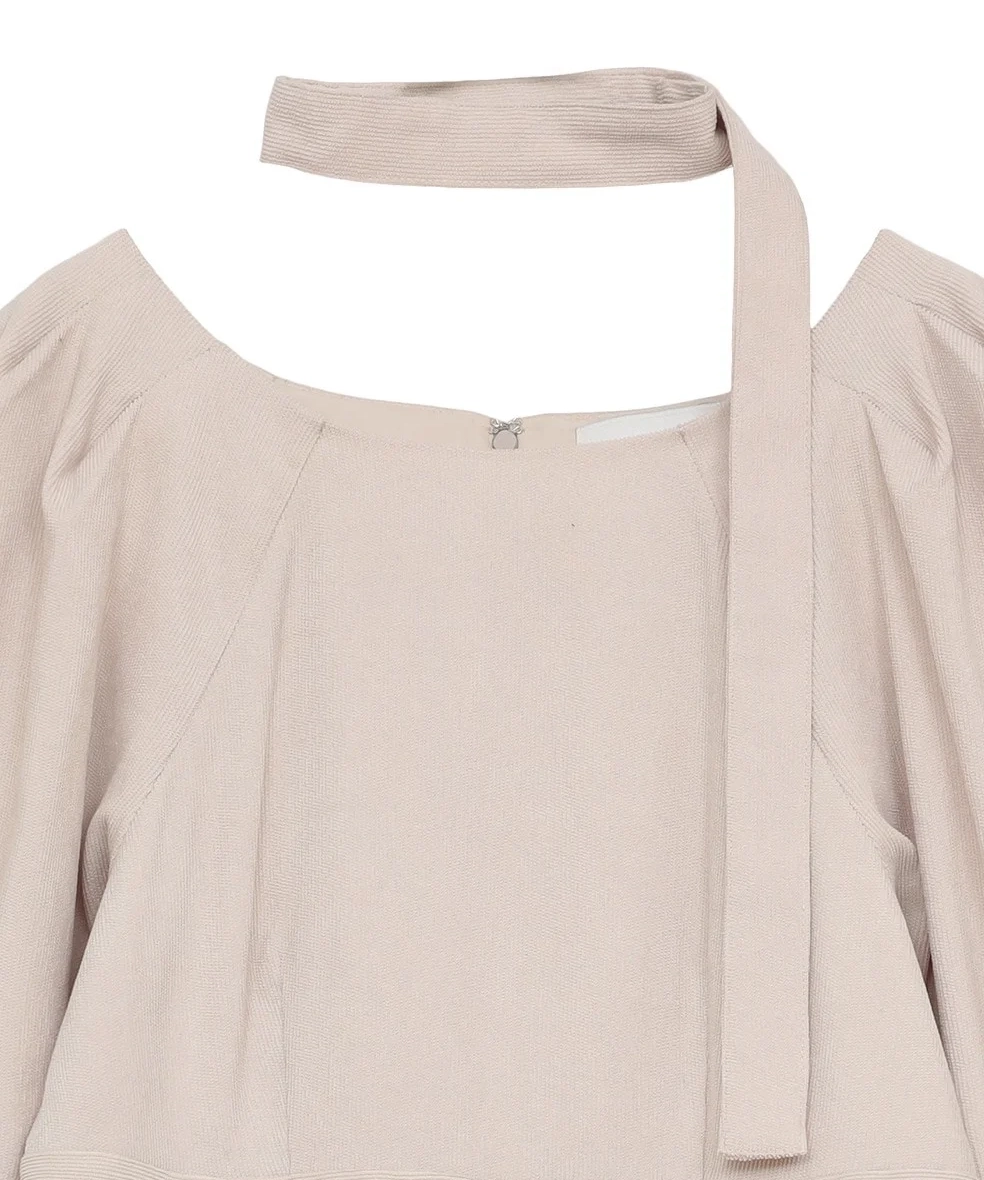 デコルテを美しく見せるネックラインに、構築的なパフスリーブが華やかさをプラス。高めのウエスト位置でスタイルアップ効果も抜群です。ショルダースナップ付きで下着が見えにくく、同素材のチョーカーも付属(取り外し可能)。