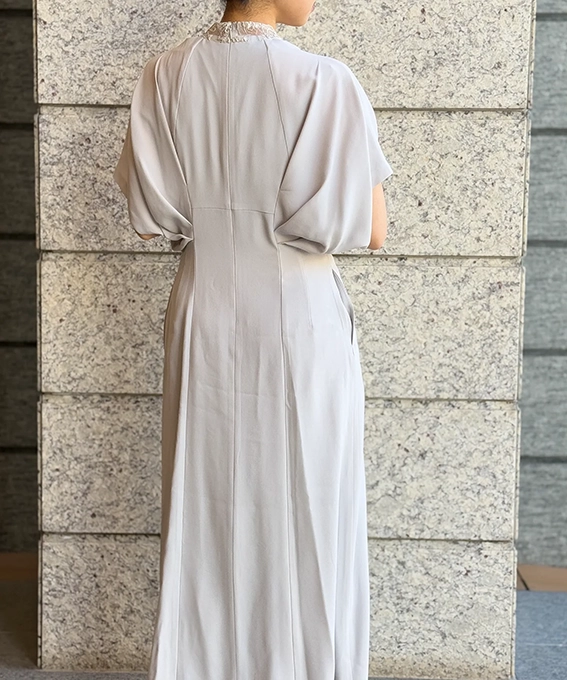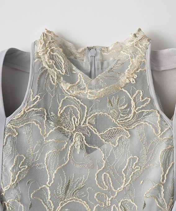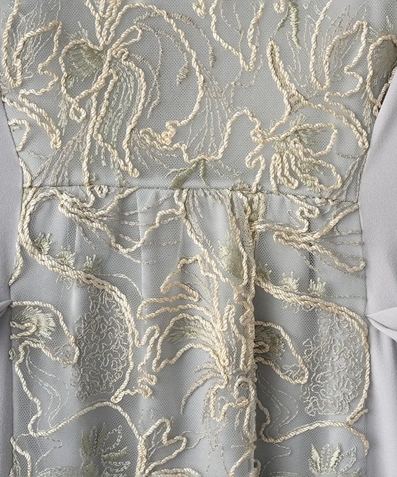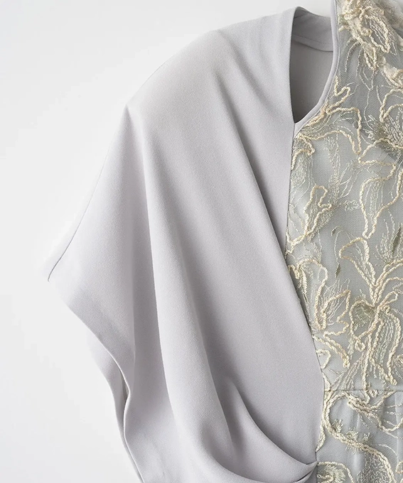 レースは日本でたった1社しか再現できない刺繍技術を用いていて、アートのような奥行きと品格が漂います。結婚式や特別なディナーに、主役級の存在感を放ちたい方におすすめです。