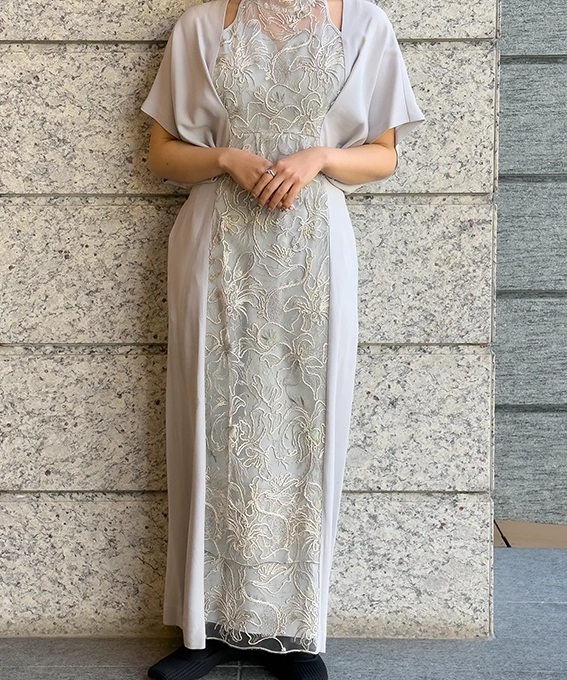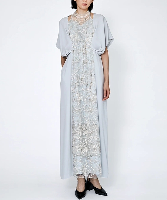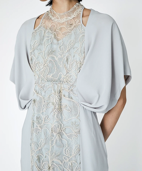 “Seem”コードエンブロイダリーレース ケープショルダードレス