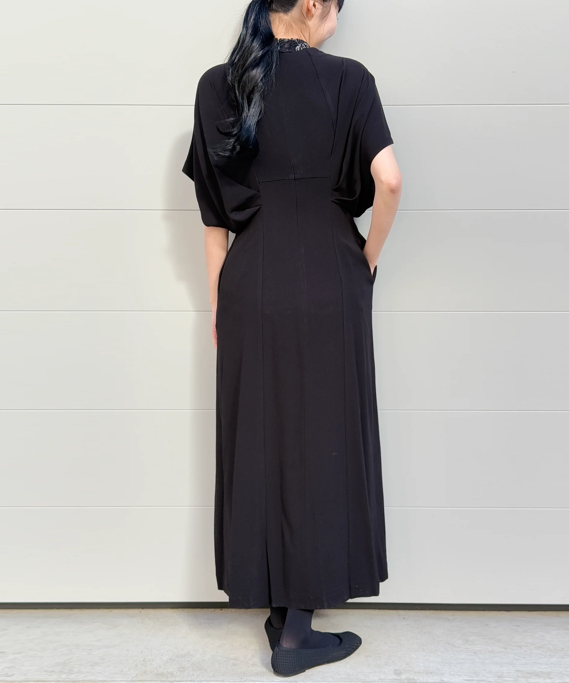 着用したときのシルエットが本当にきれいで、縦のラインがスタイルをスラリと見せてくれます。見た目の華やかさだけでなく、ポケットや透け防止の裏地付きで機能面も◎。