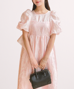 上品な光沢を放つジャカード生地を贅沢に使用した、華やかでガーリーなボリュームドレス。