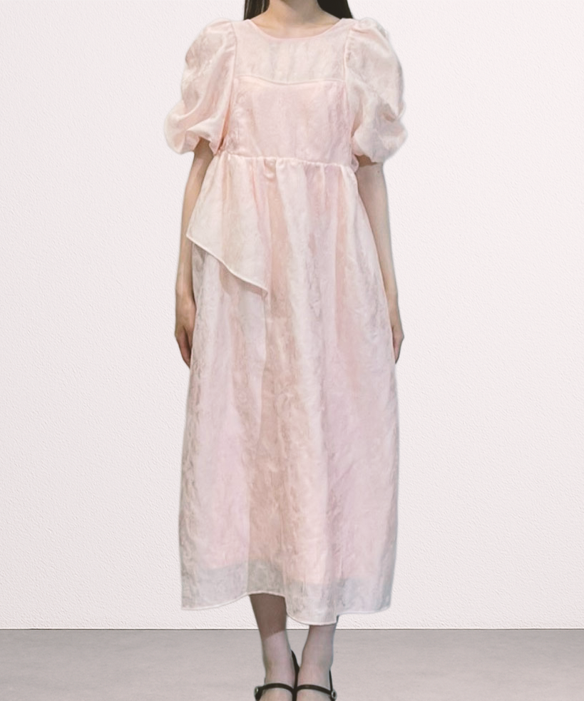 着るだけで気分が上がる、光沢ジャカードの上品なきらめきと、ふんわりパフスリーブが魅力的!アシンメトリーのフリルがアクセントになって、写真映えも間違いなしです♪