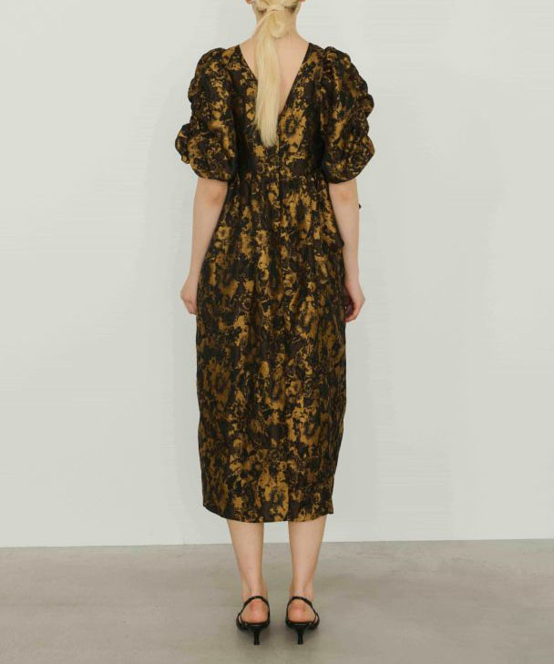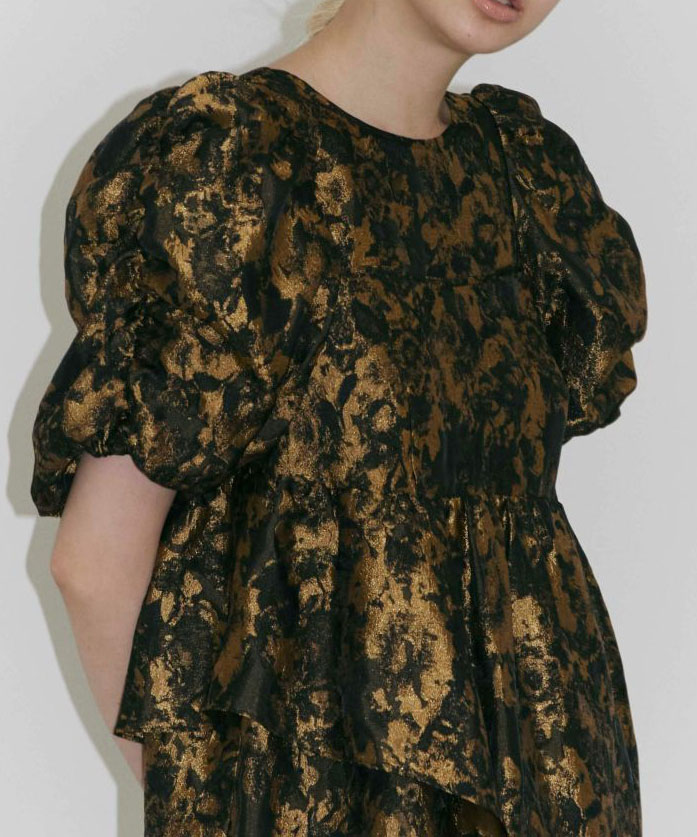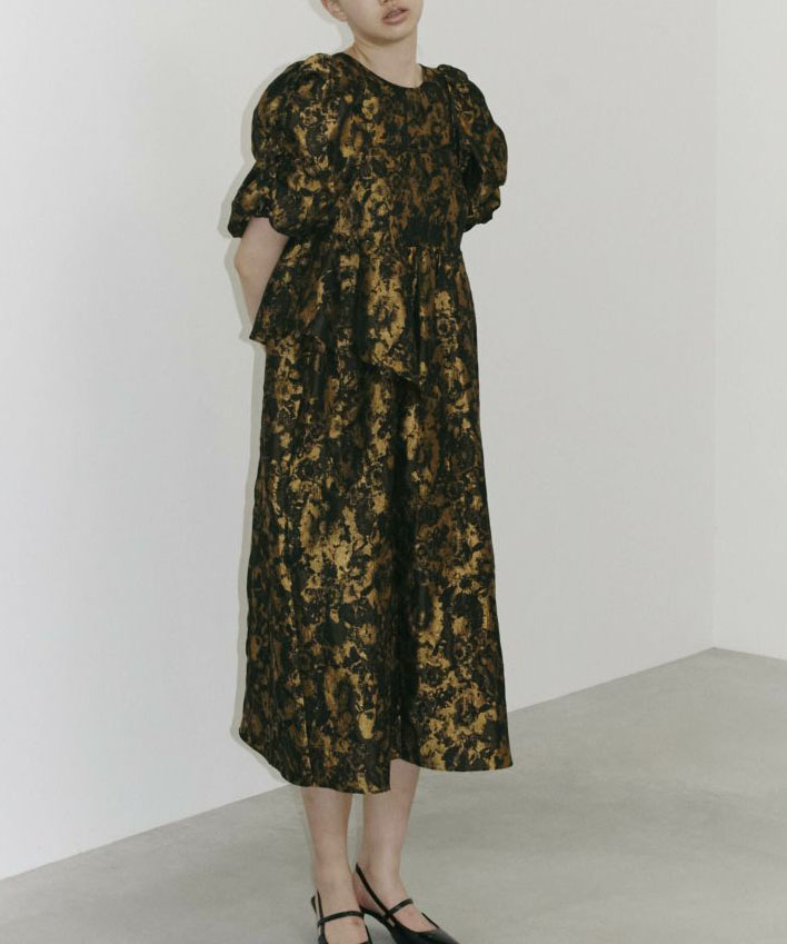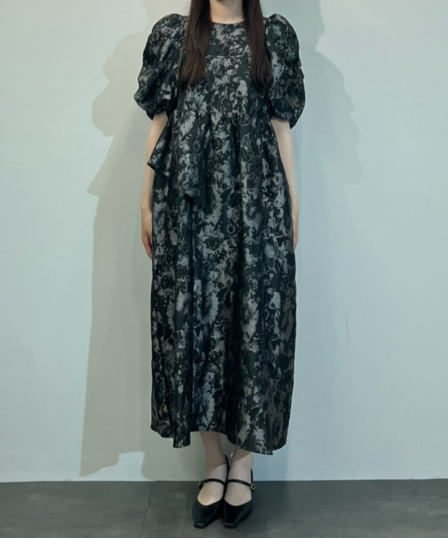 上品な光沢を放つジャカード生地を贅沢に使用した、華やかでガーリーなボリュームドレス。