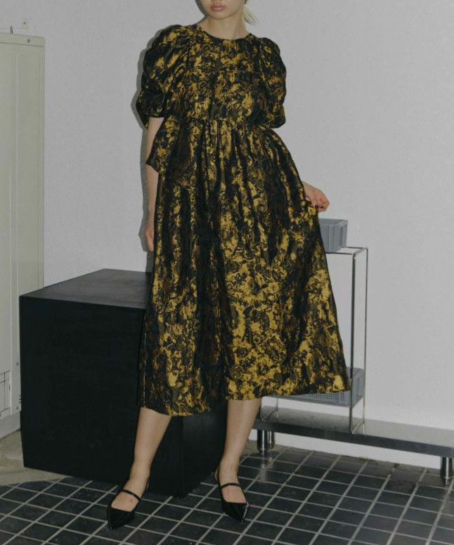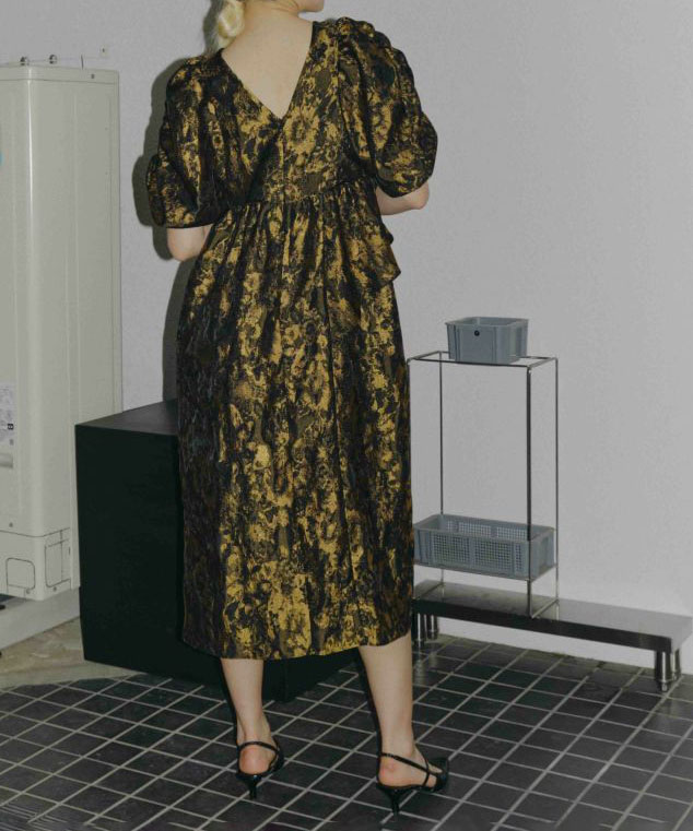上品な光沢を放つジャカード生地を贅沢に使用した、華やかでガーリーなボリュームドレス。
