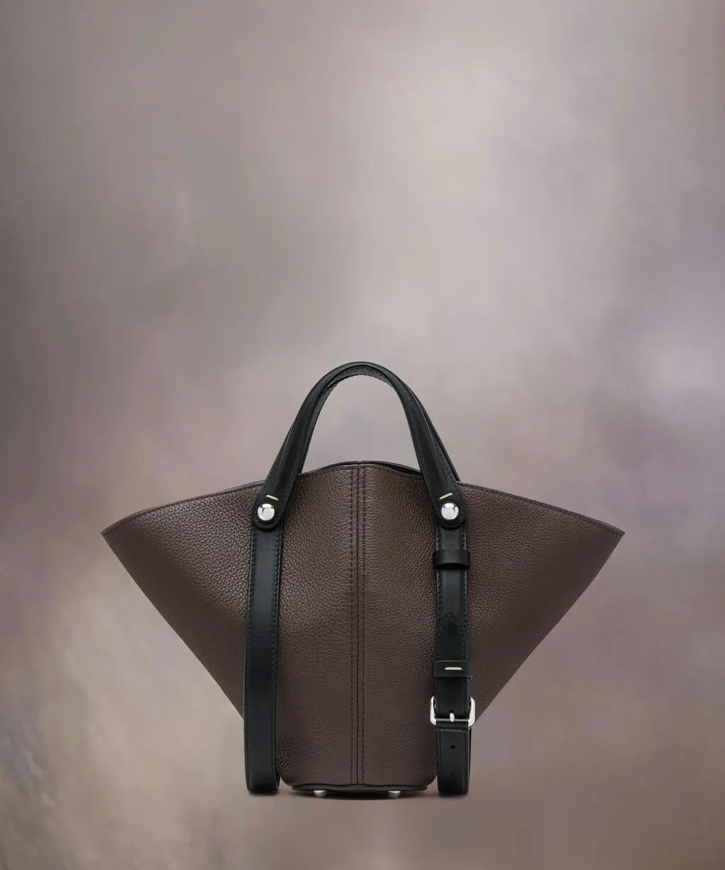 ふっくらとしたカーフスキンの質感に、円錐シルエットの立体感がモダン!使いやすいスモールサイズで、肩がけ・手持ちの2WAY仕様なのも嬉しいポイント。