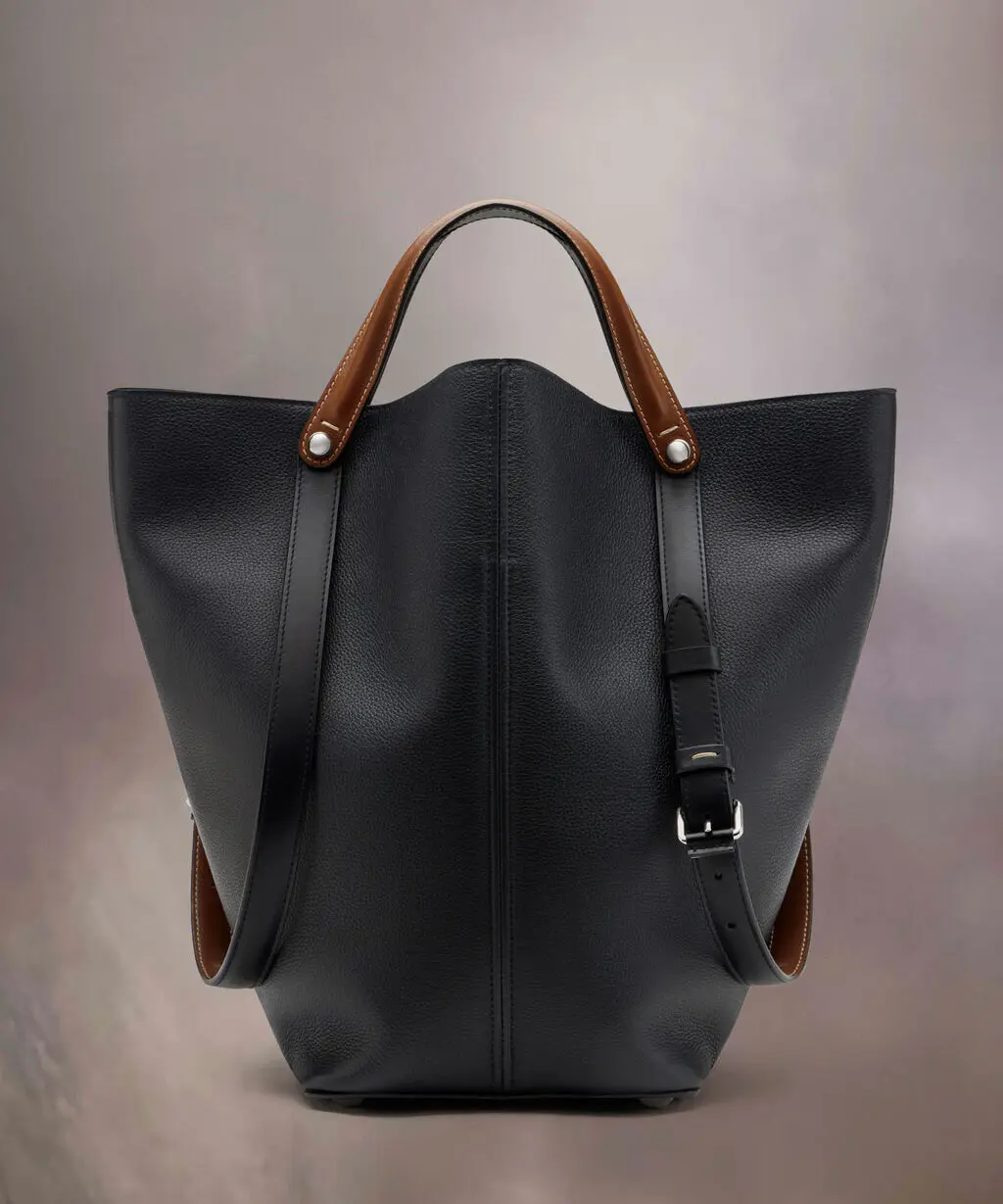 台形型のシルエットに、2WAY仕様のコントラストストラップを組み合わせることで、実用性とモード感を両立。