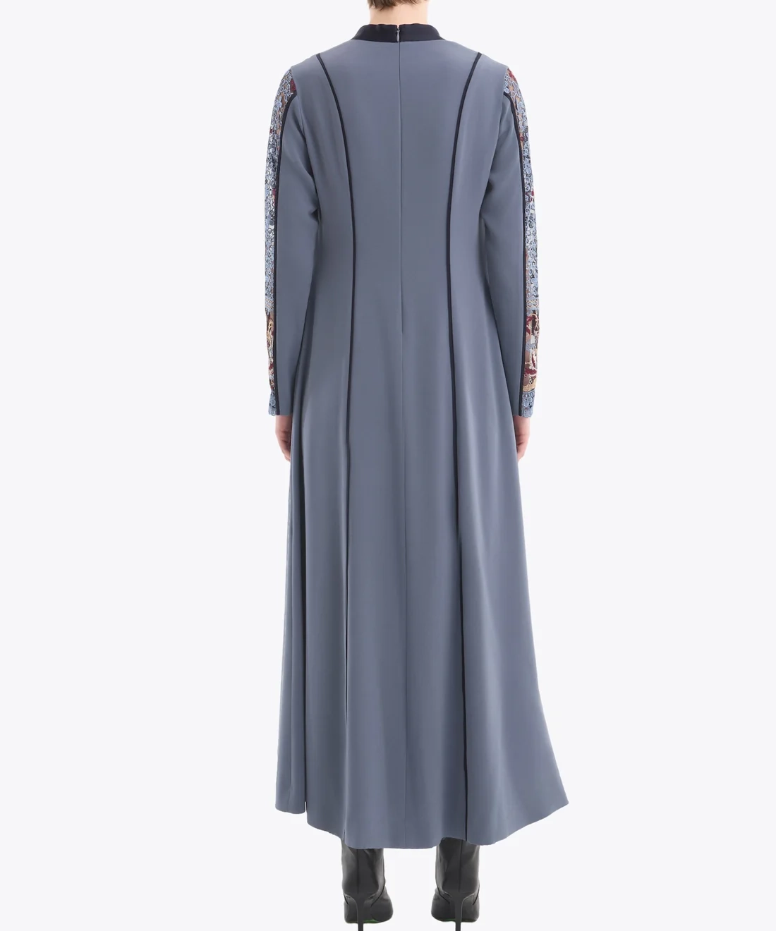 落ち感のある生地を生かしたAラインシルエットが優雅に揺れ、土台生地に配した発色の良いアセテート混素材が深みのある色彩と奥行きを演出。特別なシーンをドラマチックに彩る一着です。