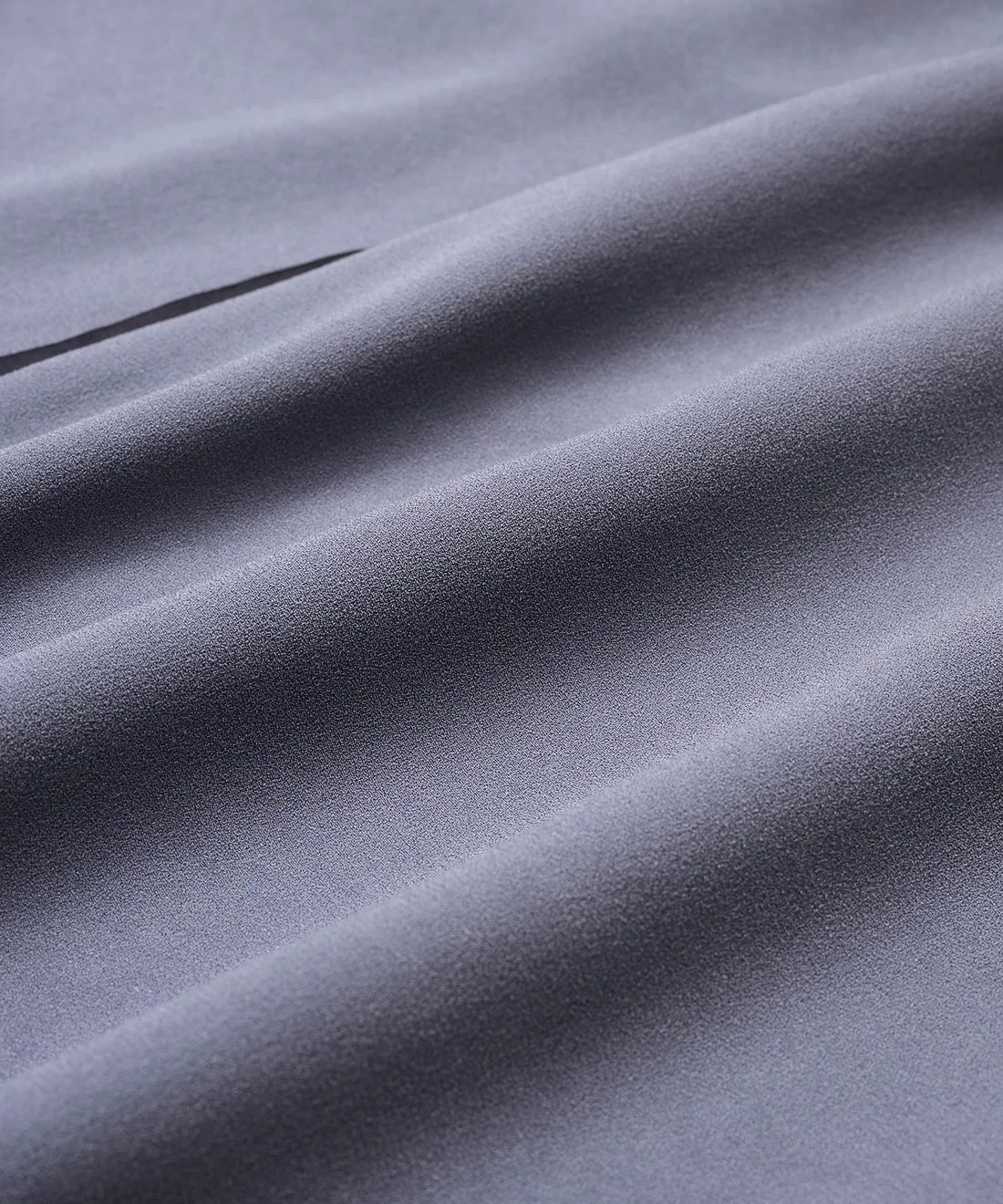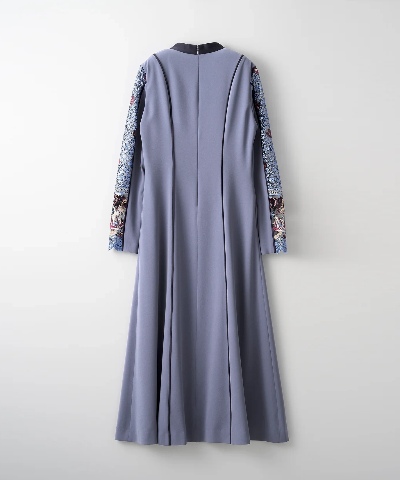 落ち感のある生地を生かしたAラインシルエットが優雅に揺れ、土台生地に配した発色の良いアセテート混素材が深みのある色彩と奥行きを演出。特別なシーンをドラマチックに彩る一着です。