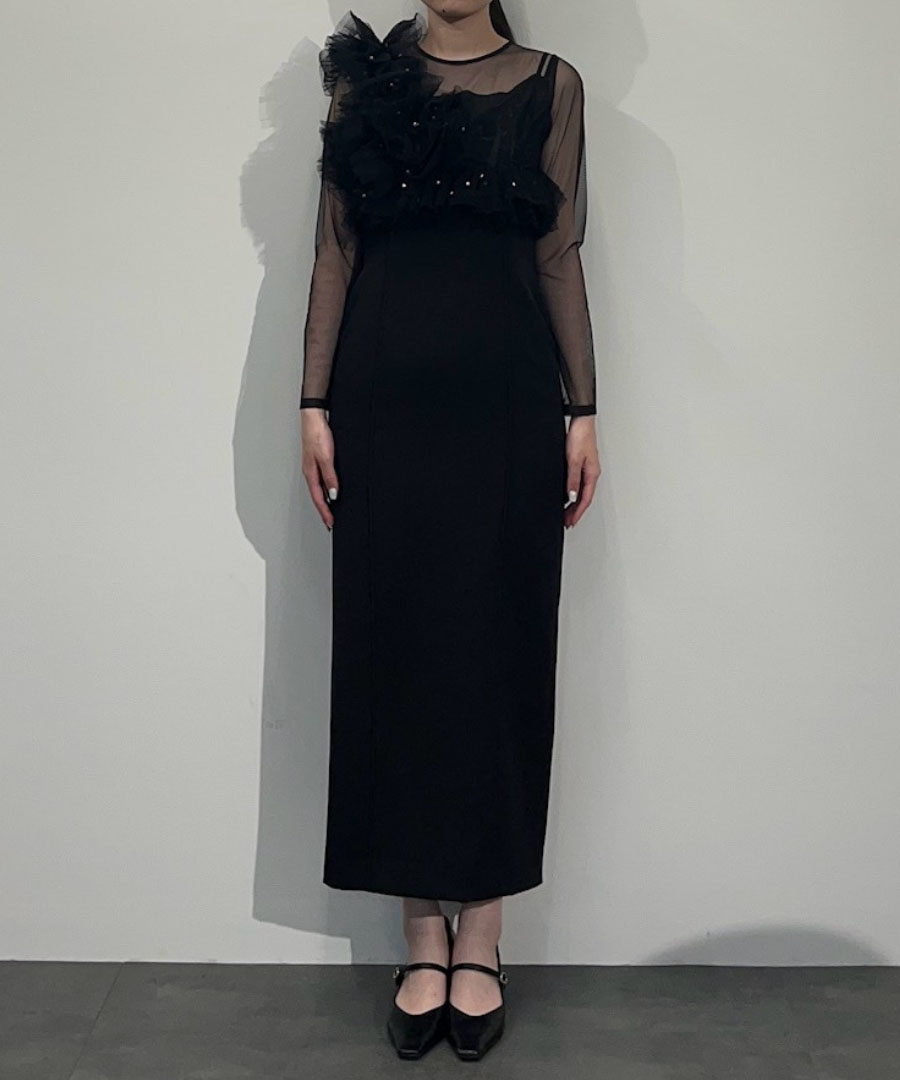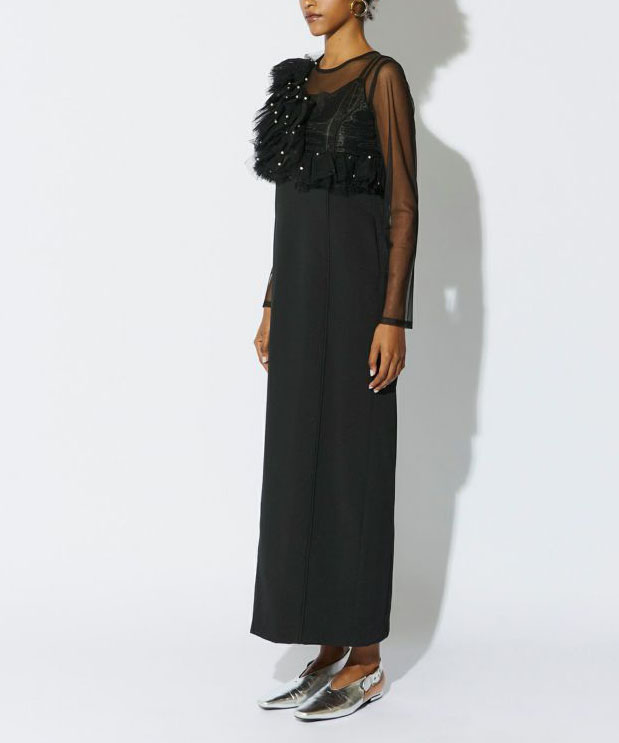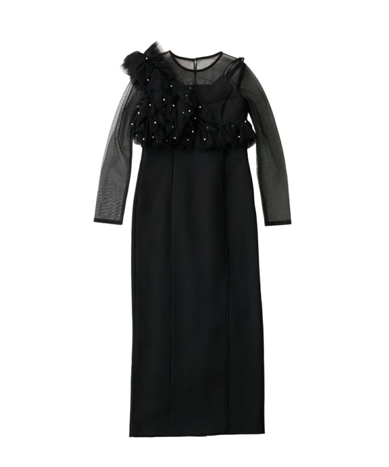 フリルチュールにランダムなパールを散りばめたビスチェと、ハリのあるダブルクロス生地のタイトワンピースを組み合わせたセットアイテム。