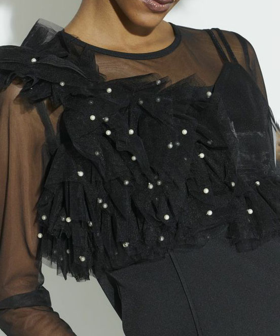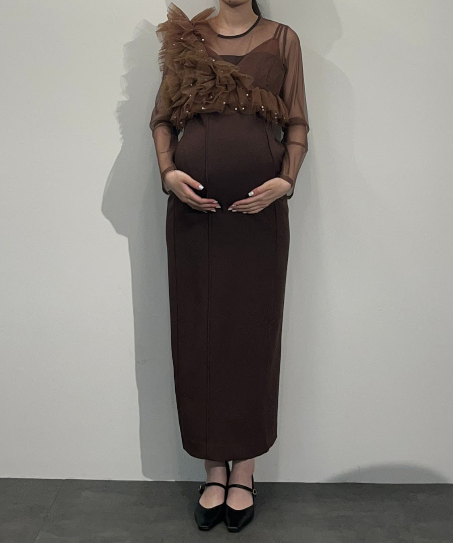 フリルチュールにランダムなパールを散りばめたビスチェと、ハリのあるダブルクロス生地のタイトワンピースを組み合わせたセットアイテム。
