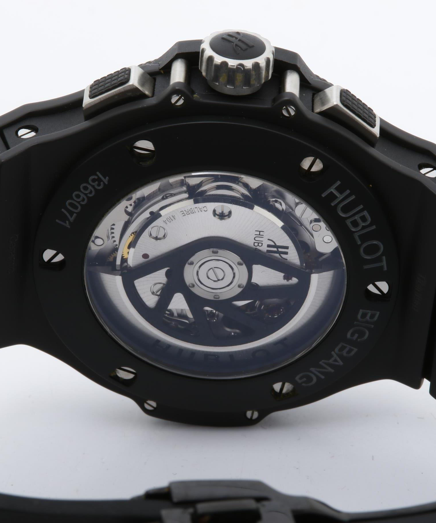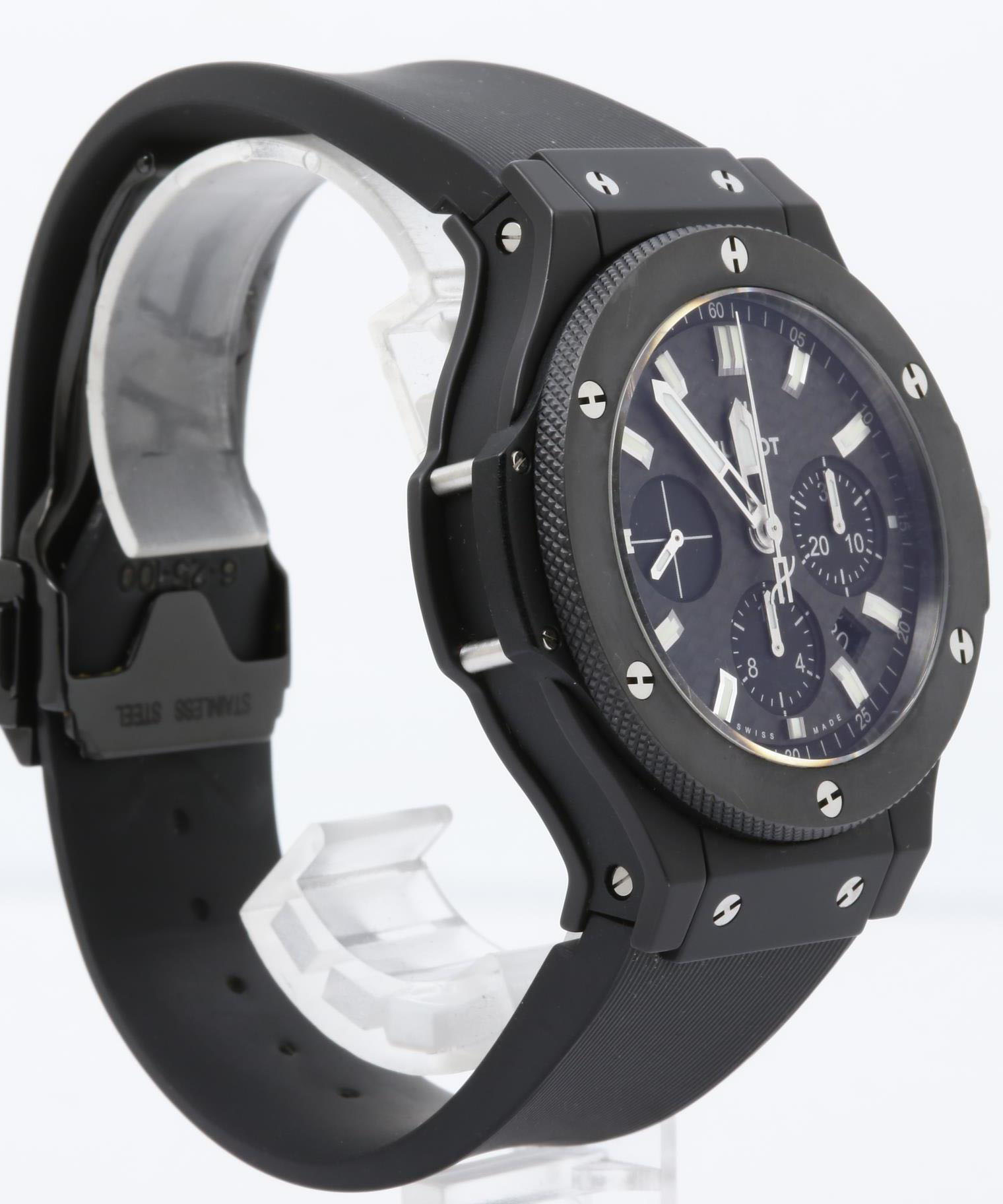 44 mmの大型ケースはマットブラックのセラミック製で、ステンレスに比べて軽量かつ傷に強いのが特徴です。ブラックラバーストラップと相まって、圧倒的な存在感と快適な装着感を両立。搭載ムーブメントは自動巻きクロノグラフ Cal.HUB4100。30 分・12 時間積算計とデイト表示を備え、100 m防水(メーカー公称)で日常使いからアクティブシーンまで幅広く対応します。
