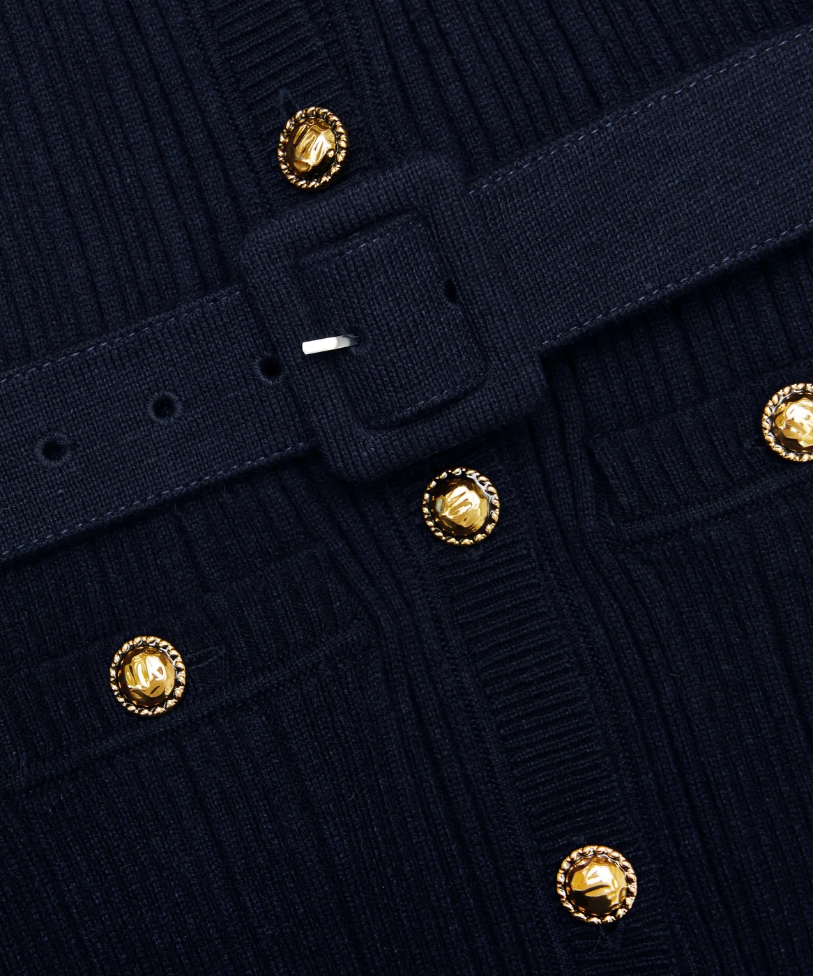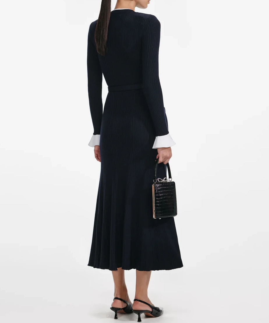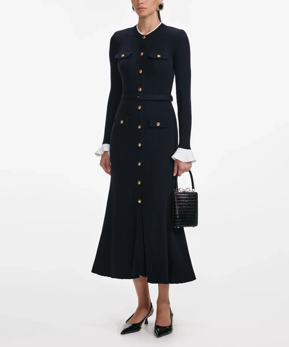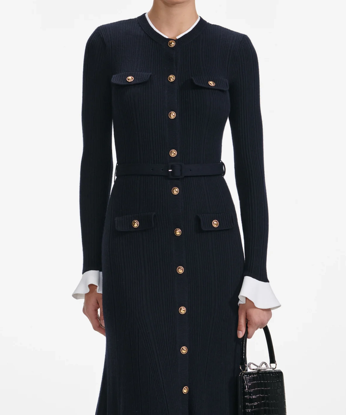 仕立ての美しさとニットの心地よさを兼ね備えた、ヴィスコースウールのミディドレス。ソフトな編地が身体にほどよく沿い、ストレッチ性があるため長時間の着用も快適です。前立てに並ぶゴールドボタンとフレアスリーブがエレガントなアクセント。取り外し可能なベルトでウエストを絞れば、裾に向かって広がるフレアヘムがさらに際立ちフェミニンなシルエットを演出します。フロントボタン開閉、実用的なポケット付き。