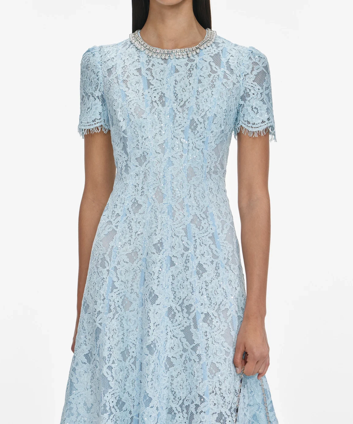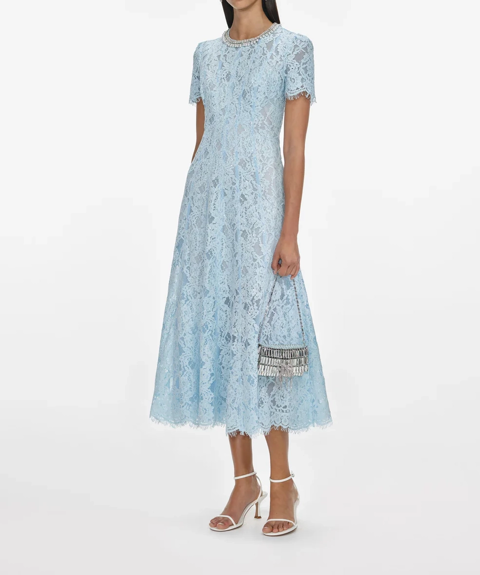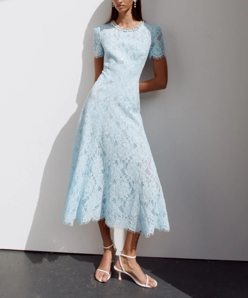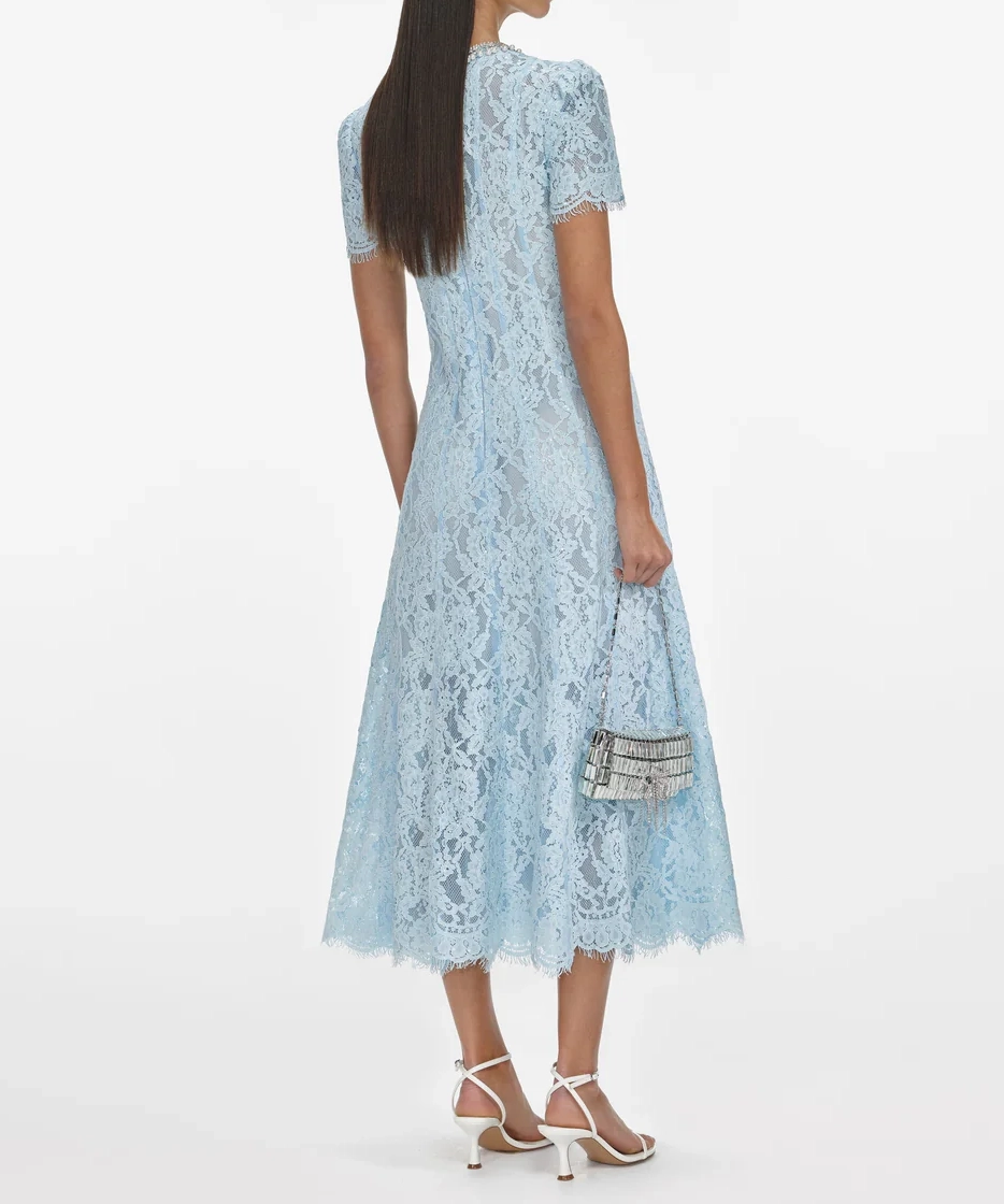 ロマンティックなブルーレースで仕立てたフィット&フレアのミディドレス。ドレープが美しいフレアスカートに、デコルテを飾るダイヤモンド調&パールのネックラインがジュエリー要らずの華やぎを添えます。背面はコンシールジップ、ひざ下まで裏地付きで安心の着用感。伸縮性は控えめなので、サイズに迷った場合はワンサイズ上がおすすめです。