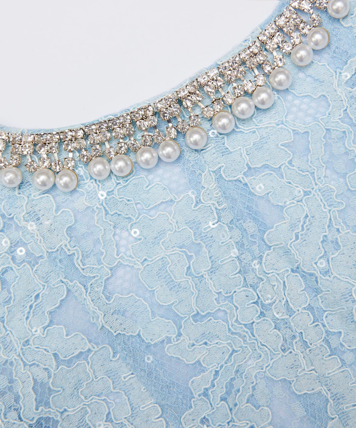 繊細なブルーレースにビジュー&パールが瞬く主役級ドレス。ウエストはキュッ、裾はふわりと広がるシルエットが写真映えし、結婚式やガラディナー、ホリデーパーティーに最適です。ジュエリーをプラスするならイヤリングだけで十分。足元はシルバーやヌードトーンのヒールで軽やかにまとめると、レースの美しさがより引き立ちます。