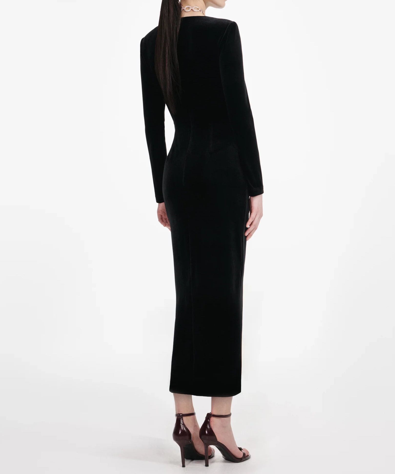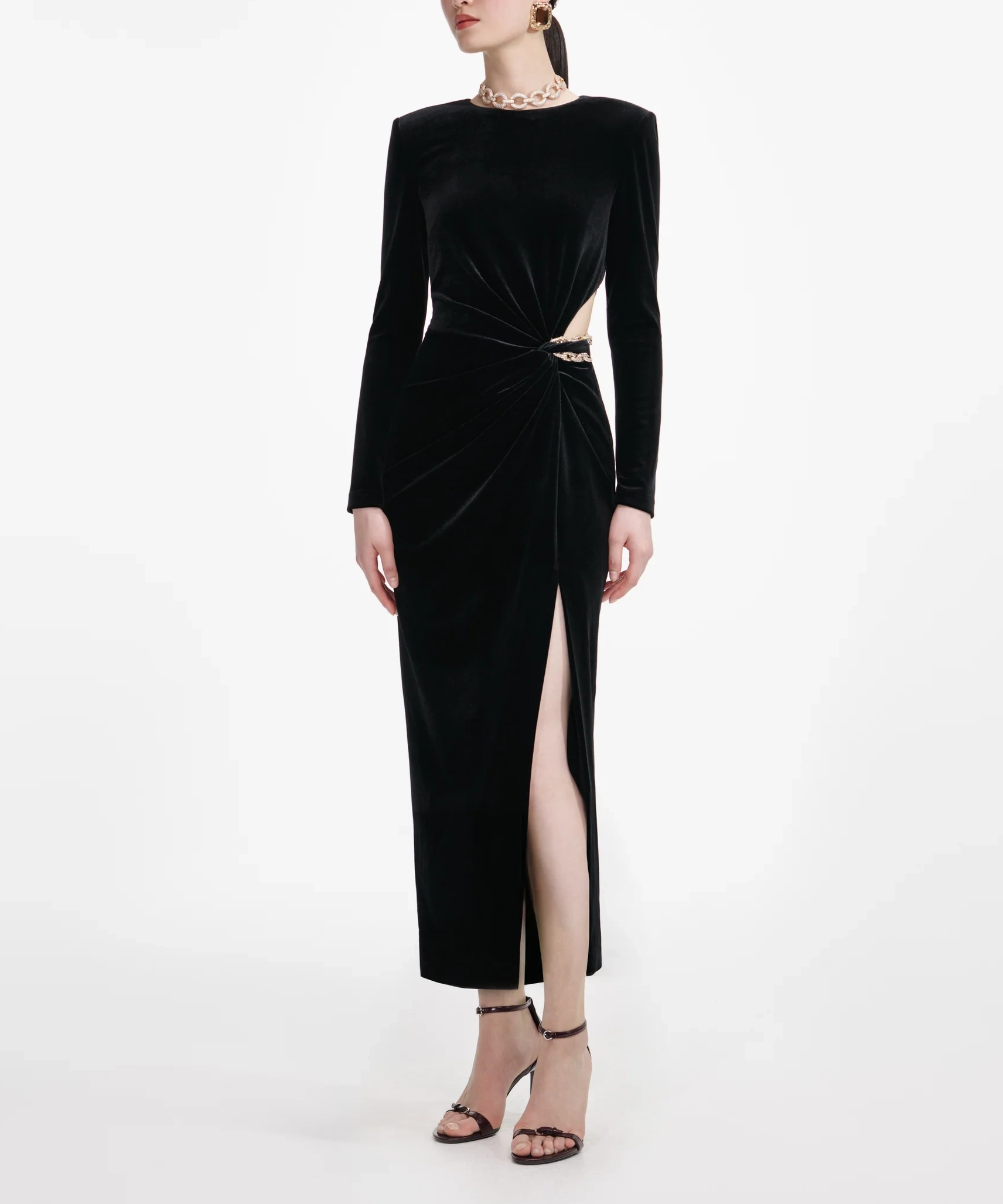 ベルベットのリッチな質感とサイドのカットアウトで “魅せる” ドレス。煌めくゴールドチェーンがジュエリー代わりとなり、ハイヒールを合わせれば完璧なフェムファタールスタイルに。肩パッドを外せば抜け感のあるシルエットに調整可能。シャンパンバーや大人のディナーデート、アフターシアターなど夜の特別なシーンにぜひ。