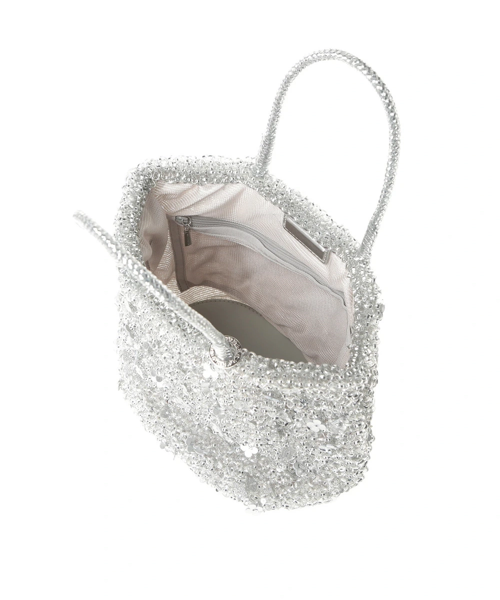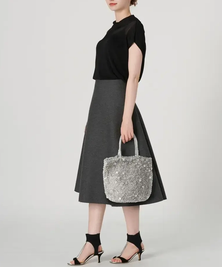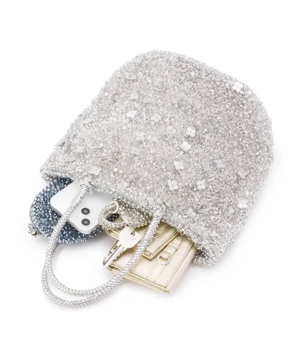 きらめくシルバーと可憐な花ビーズが、デニムにもサマードレスにも映える万能バスケット。広めのマチでランチボックスやカーディガンまで入るので、ピクニックやリゾートはもちろん、普段のお買い物にも重宝します。底がしっかりしているので置いたときに倒れにくく、仕切り代わりの内ポケットで小物も迷子になりません。カジュアルスタイルに女性らしさを添えたい日、ぜひ手に取ってみてください。