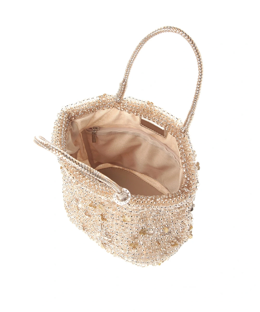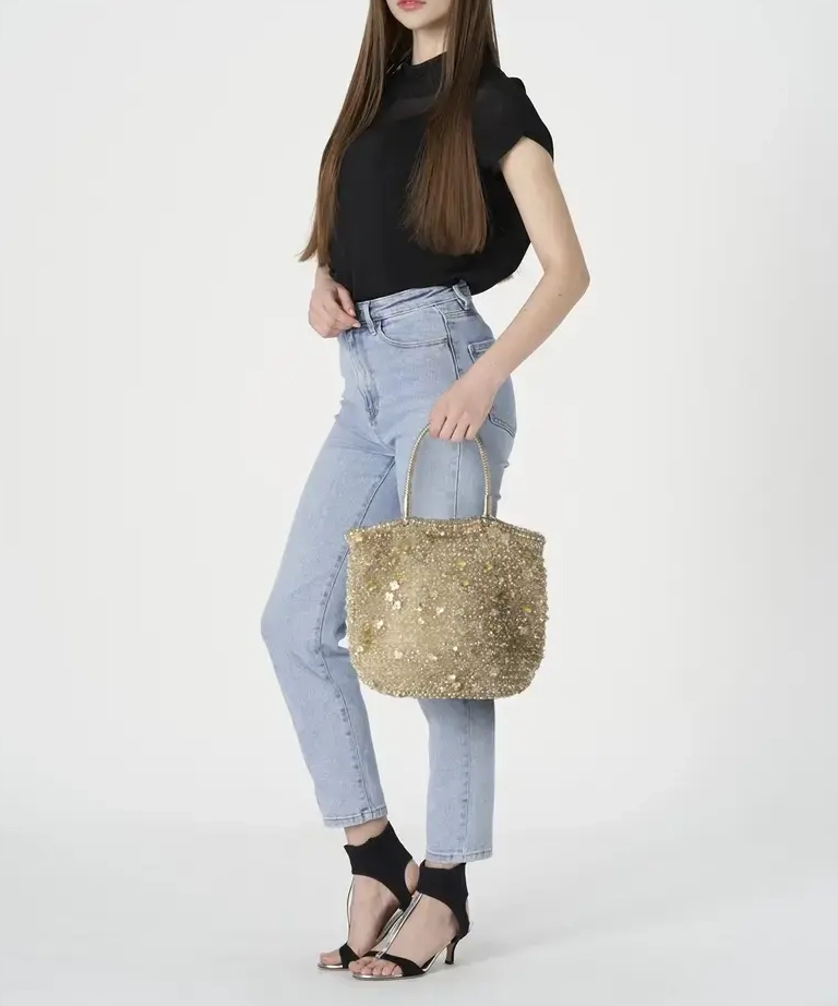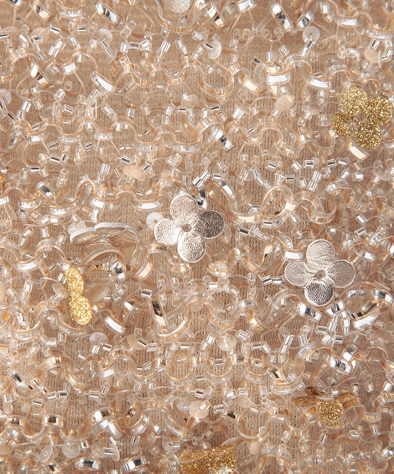 ジュエリーのように輝くシルバーゴールドは、デニムのカジュアルにもブラックドレスのパーティースタイルにも溶け込む万能トーン。底が広く自立するため、ランチボックスやストールも楽々入り、荷物が多い日でも安心です。内ポケットが仕切り代わりになるので鍵やリップも迷子にならず、実用性も◎。休日のお出かけはもちろん、リゾートやイベントシーンでも花ビーズがライトを受けて華やかに映えます。持つだけで気分が上がるアイコンバッグを、ぜひワードローブの主役に。