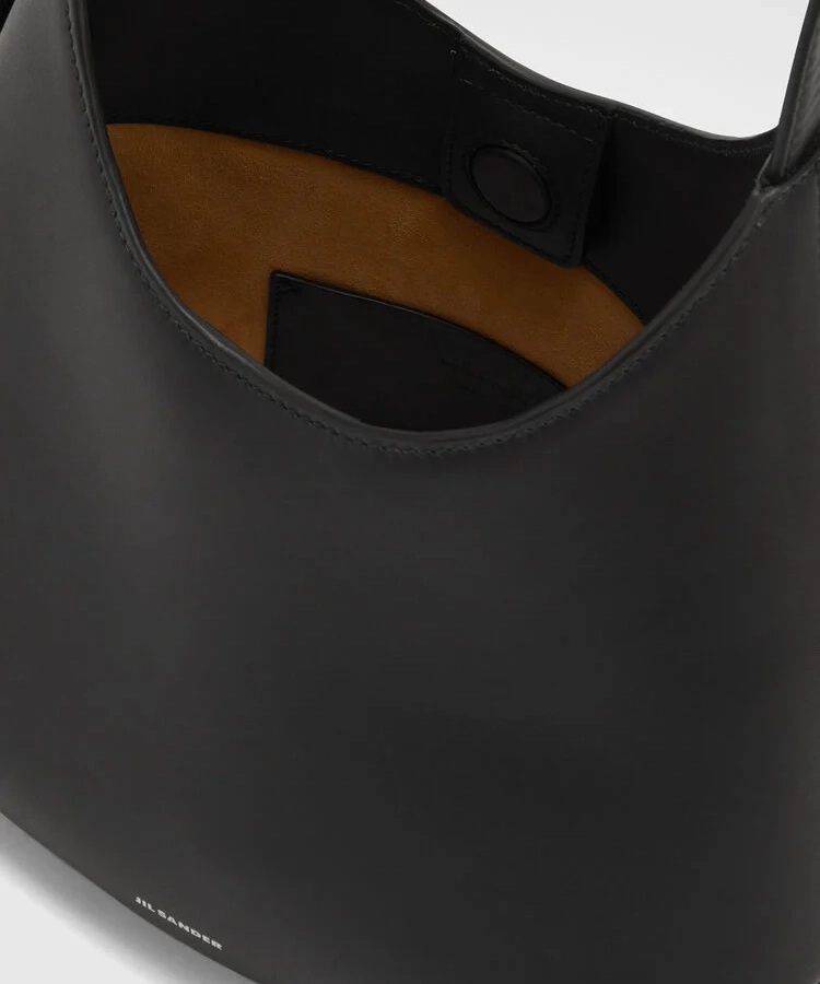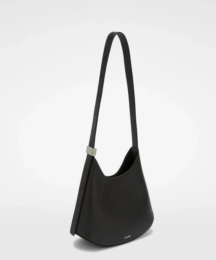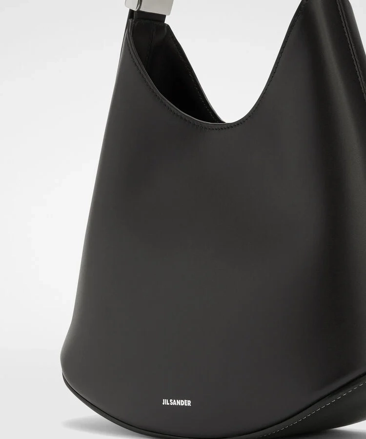 ミニマルな美学を体現する〈Jil Sander Eldorado Small〉ショルダーバッグ。柔らかなスムースカーフレザーをカーブシェイプに仕立て、フラップにジュエリーライクなメタルバックルをあしらいました。内側はベロアライニングとフラットポケットで上質かつ実用的。マグネットボタンで開閉もスムーズに行えます。ストラップは63 cmまで調節可能で、ショルダーにもクロスボディにも対応。フラップ下にはフォイルエンボスのJil Sanderロゴがさりげなく輝き、装いにクリーンなアクセントを添えます。