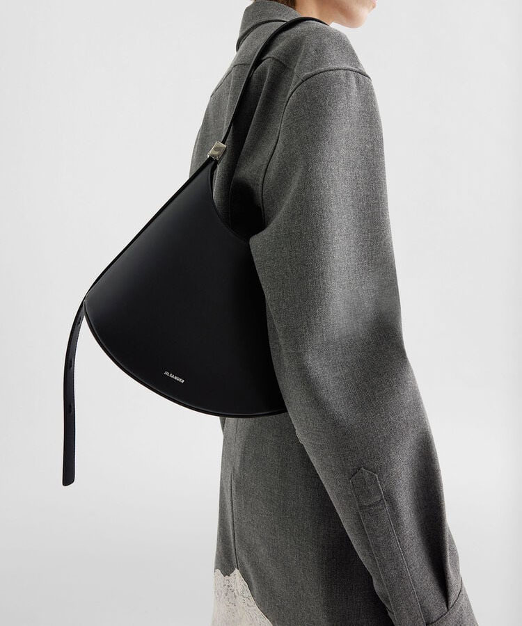 滑らかなカーフレザーと控えめなロゴ、曲線を描くフォルムがJil Sanderらしい“静かなラグジュアリー”を体現。一見コンパクトながら長財布・スマートフォン・ミニポーチが収まり、デイリーからオケージョンまで幅広く活躍します。ストラップを短めにして肩掛けすれば都会的な印象に、長めにしてクロスボディにすればハンズフリーでアクティブに。モノトーンコーデに合わせてミニマルにまとめるのはもちろん、カラーニットの引き締め役としてもおすすめです。上質さと汎用性を求める方にぜひ手に取っていただきたい逸品です。