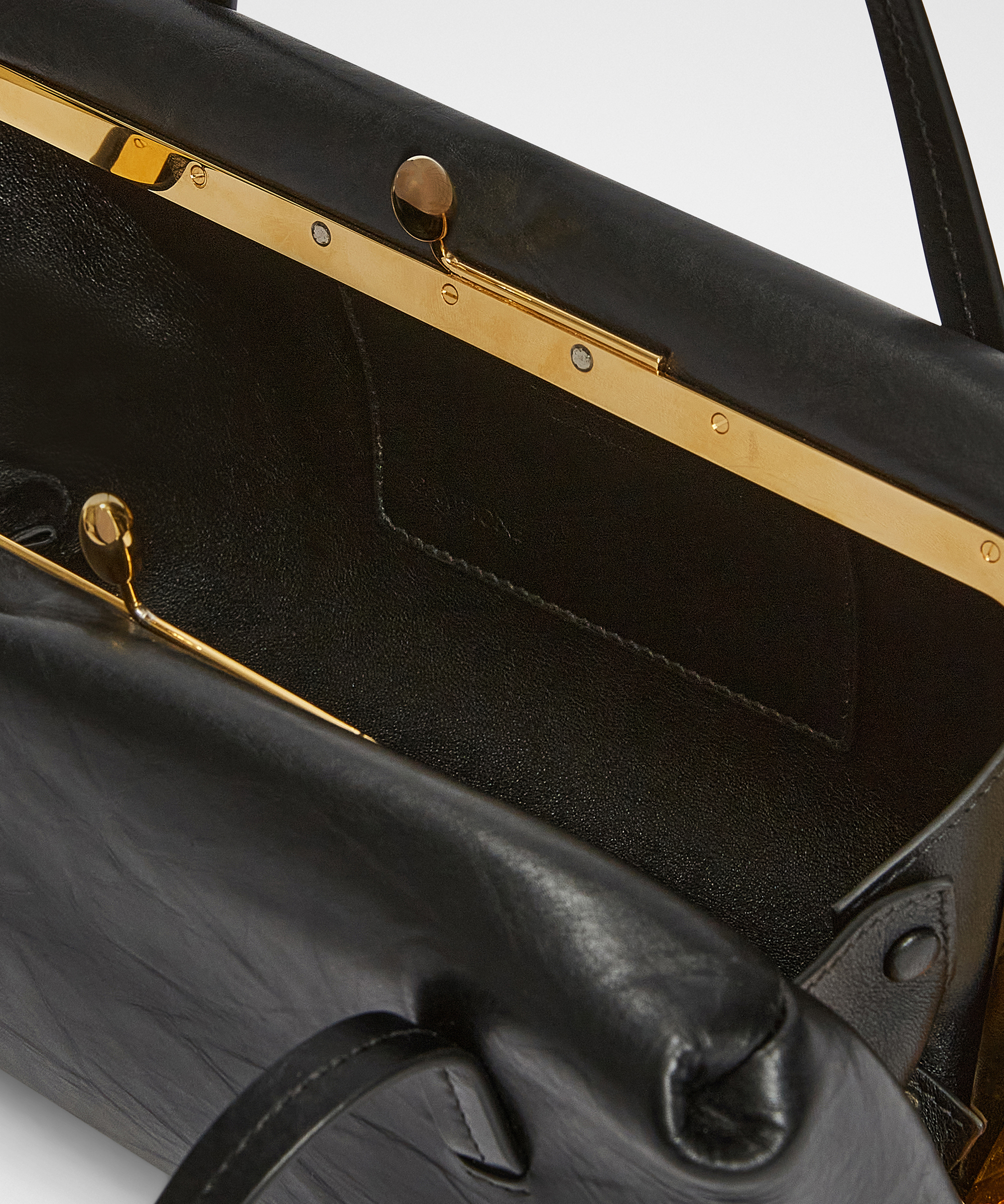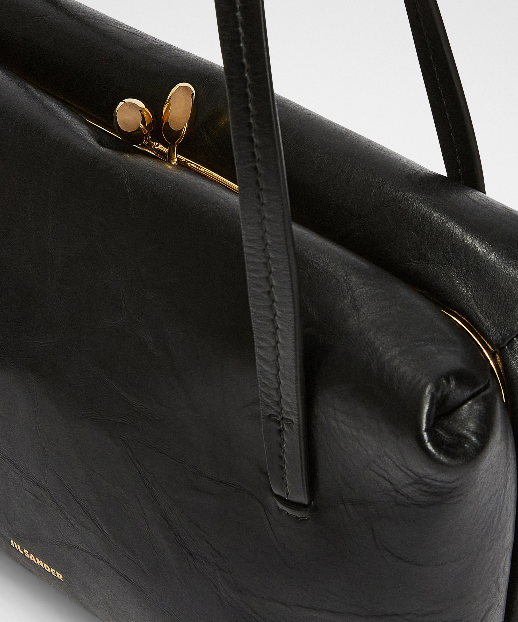 クッションのように柔らかな“ピロー”フォルムとメタルフレームのコントラストがモダンな一品。ハンドルを握ればレトロシックに、フレームを抱えてクラッチ持ちにすればイブニングバッグとしても映えます。サイドの拡張インサートで容量を調整できるため、スマホ・ミニ財布・リップ・サングラスがきれいに収まるのもポイント。シンプルコーデのアクセントに、またミニマルドレスの仕上げに――タイムレスなブラックレザーはシーズンレスで活躍し、長く愛用できること間違いなしです。
