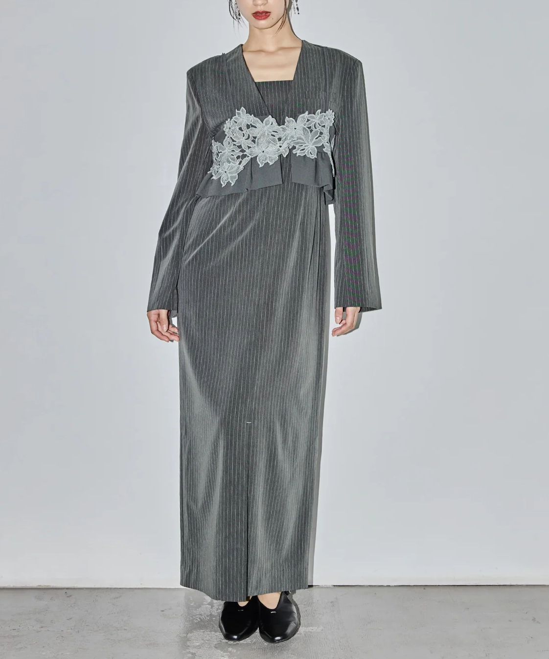 フラワー刺繍のレースビスチェと、メンズライクなピンストライプ柄ワンピースの組み合わせが目を引く、洗練されたデザイン。ディテールにもこだわり、V字の胸元には取り外し可能な胸当てを採用し、シーンに応じた着こなしが楽しめます。
