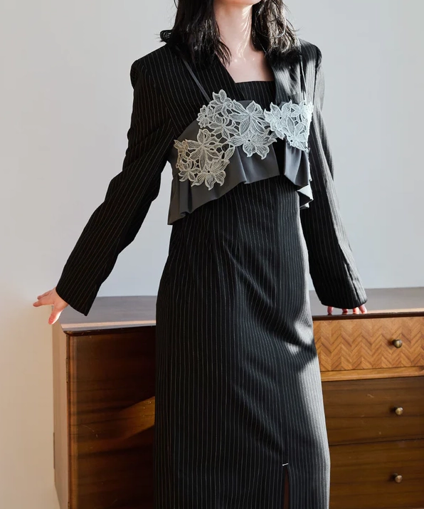フラワー刺繍のレースビスチェと、メンズライクなピンストライプ柄ワンピースの組み合わせが目を引く、洗練されたデザイン。ディテールにもこだわり、V字の胸元には取り外し可能な胸当てを採用し、シーンに応じた着こなしが楽しめます。